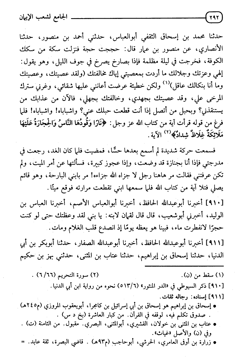 911 - أَخْبَرَنَا أَبُو عَبْدِ اللهِ الْحَافِظُ، أَخْبَرَنَا أَبُو عَبْدِ اللهِ الصَّفَّارُ، حَدَّثَنَا أَبُو بَكْرِ بْنُ أَبِي الدُّنْيَا، حَدَّثَنَا إِسْحَاقُ بْنُ إِبْرَاهِيمَ، حَدَّثَنَا عَتَّابُ بْنُ الْمُثَنَّى، حَدَّثَنِي بَهْزُ بْنُ حَكِيمٍ -[293]- قَالَ: §" أَمَّنَا زُرَارَةُ بْنُ أَبِي أَوْفَى فِي مَسْجِدِ قُشَيْرٍ فَقَرَأَ الْمُدَّثِّرَ فَلَمَّا انْتَهَى إِلَى هَذِهِ الْآيَةِ {فَإِذَا نُقِرَ فِي النَّاقُورِ} [المدثر: 8] خَرَّ مَيِّتًا قَالَ بَهْزٌ: فَكُنْتُ فِيمَنْ حَمَلَهُ "