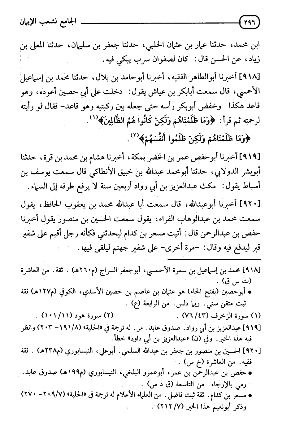 918 - أَخْبَرَنَا أَبُو طَاهِرٍ الْفَقِيهُ، أَخْبَرَنَا أَبُو حَامِدِ بْنُ بِلَالٍ، حَدَّثَنَا مُحَمَّدُ بْنُ إِسْمَاعِيلَ الْأَحْمَسِيُّ قَالَ: سَمِعْتُ أَبَا بَكْرِ بْنَ عَيَّاشٍ يَقُولُ: دَخَلْتُ عَلَى أَبِي حُصَيْنٍ أَعُودُهُ وَهُوَ قَاعِدٌ هَكَذَا وَخَفَضَ أَبُو بَكْرٍ رَأْسَهُ حَتَّى جَعَلَهُ بَيْنَ رُكْبَتَيْهِ وَهُوَ قَاعِدٌ فَقَالَ: " §لَوْ رَأَيْتَهُ لَرَحِمْتَهُ ثُمَّ قَرَأَ {وَمَا ظَلَمْنَاهُمْ وَلَكِنْ كَانُوا هُمُ الظَّالِمِينَ} [الزخرف: 76] {وَمَا ظَلَمْنَاهُمْ، وَلَكِنْ ظَلَمُوا أَنْفُسَهُمْ} [هود: 101] "