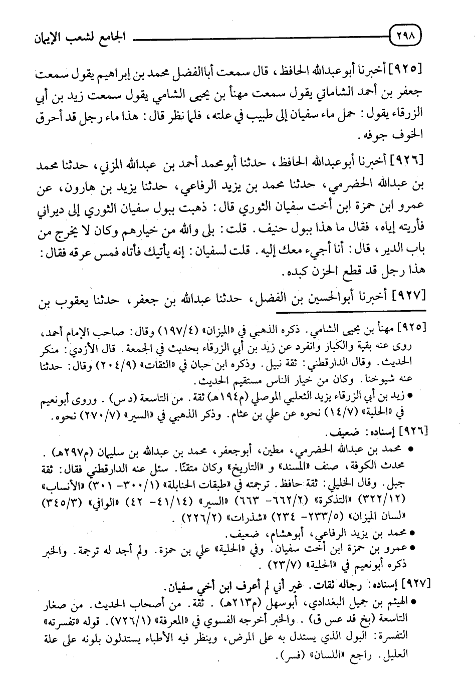 926 - أَخْبَرَنَا أَبُو عَبْدِ اللهِ الْحَافِظُ، حَدَّثَنَا أَبُو مُحَمَّدٍ أَحْمَدُ بْنُ عَبْدِ اللهِ الْمُزَنِيُّ، حَدَّثَنَا مُحَمَّدُ بْنُ عَبْدِ اللهِ الْحَضْرَمِيُّ، حَدَّثَنَا مُحَمَّدُ بْنُ يَزِيدَ الرِّفَاعِيُّ، حَدَّثَنَا يَزِيدُ بْنُ هَارُونَ، عَنْ عَمْرِو بْنِ حَمْزَةَ ابْنِ أُخْتِ سُفْيَانَ الثَّوْرِيِّ قَالَ: " §ذَهَبْتُ بِبَوْلِ سُفْيَانَ الثَّوْرِيِّ إِلَى دِّيرَانِيٍّ فَأَرَيْتُهُ إِيَّاهُ، فَقَالَ: مَا هَذَا بِبَوْلِ حَنِيفٍ، قُلْتُ: بَلَى، وَاللهِ مِنْ خِيَارِهِمْ وَكَانَ لَا يَخْرُجُ مِنْ بَابِ الدَّيْرِ، قَالَ: أَنَا أَجِيءُ مَعَكَ إِلَيْهِ، قُلْتُ لِسُفْيَانَ: إِنَّهُ يَأْتِيكَ فَأَتَاهُ فَمَسَّ عَرَقَهُ، فَقَالَ: هَذَا رَجُلٌ قَدْ قَطَعَ الْحُزْنُ كَبِدَهُ "