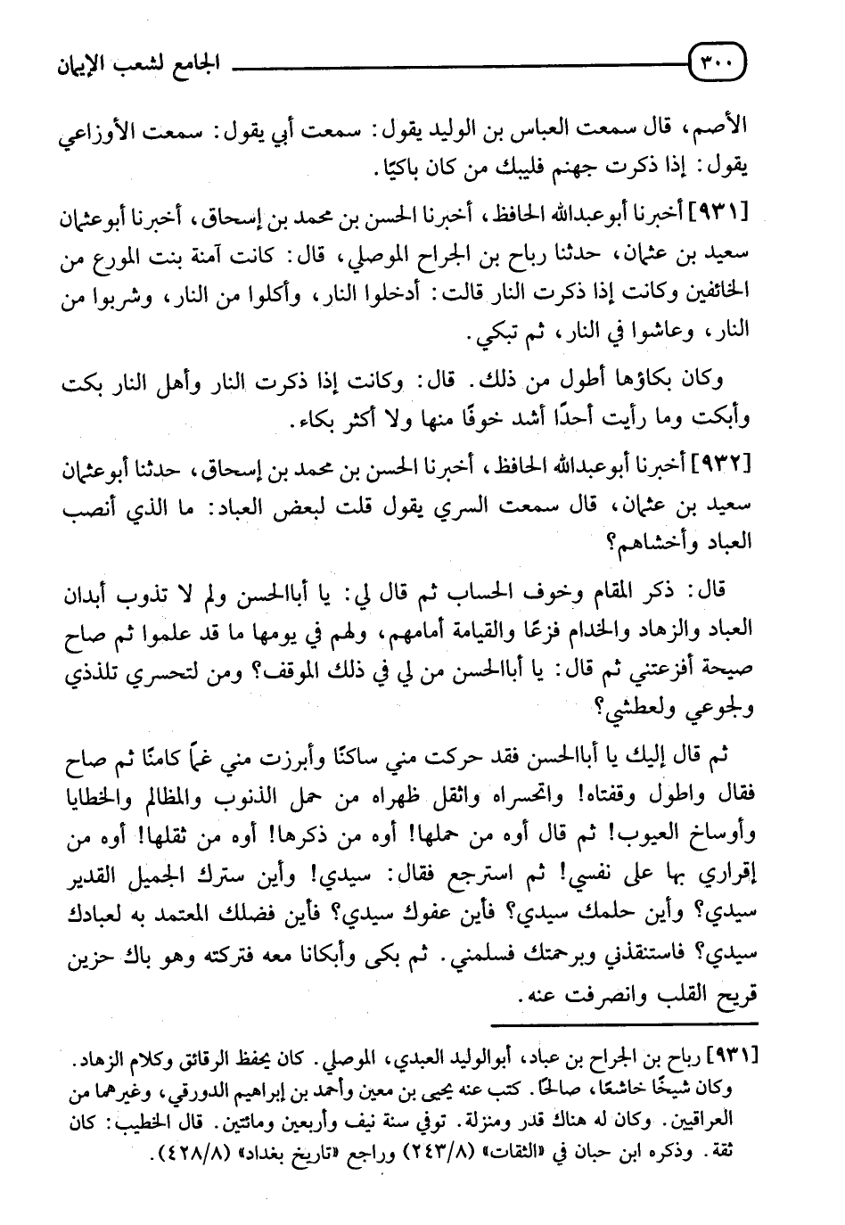 932 - أَخْبَرَنَا أَبُو عَبْدِ اللهِ الْحَافِظُ، أَخْبَرَنَا الْحَسَنُ بْنُ مُحَمَّدِ بْنِ إِسْحَاقَ، حَدَّثَنَا أَبُو عُثْمَانَ سَعِيدُ بْنُ عُثْمَانَ قَالَ: سَمِعْتُ السَّرِيَّ يَقُولُ: قُلْتُ لِبَعْضِ الْعُبَّادِ: مَا الَّذِي أَنْصَبَ الْعُبَّادَ وَأَخْشَاهُمْ؟ قَالَ: ذِكْرُ الْمَقَامِ وَخَوْفُ الْحِسَابِ ثُمَّ قَالَ لِي: يَا أَبَا الْحَسَنِ وَلِمَ لَا تَذُوبُ أَبْدَانُ الْعُبَّادِ وَالزُّهَّادِ وَالْخُدَّامِ فَزَعًا وَالْقِيَامَةَ أَمَامَهُمْ وَلَهُمْ فِي يَوْمِهَا مَا قَدْ عَلِمُوا ثُمَّ صَاحَ صَيْحَةً أَفْزَعَتْنِي ثُمَّ قَالَ: يَا أَبَا الْحَسَنِ، مَنْ لِي فِي ذَلِكَ الْمَوْقِفِ وَمَنْ لِتَحَسُّرِي تَلَذُّذِي وَلِجُوعِي وَلِعَطَشِي؟ ثُمَّ قَالَ: إِلَيْكَ يَا أَبَا الْحَسَنِ فَقَدْ حَرَّكْتَ مِنِّي سَاكِنًا وَأَبْرَزْتَ مِنِّي غَمًّا كَامِنًا ثُمَّ صَاحَ فَقَالَ: §" وَاطُولَ وَقْفَتَاهُ وَاتَحَسُّرَاهُ وَاثِقَلَ ظَهْرَاهُ مِنْ حَمْلِ الذُّنُوبِ وَالْمَظَالِمِ وَالْخَطَايَا وَأَوْسَاخِ الْعُيُوبِ ثُمَّ قَالَ: أَوَّهْ مِنْ حَمْلِهَا أَوَّهْ مِنْ ذِكْرِهَا أَوَّهْ مِنْ ثِقَلِهَا أَوَّهْ مِنْ إِقْرَارِي بِهَا عَلَى نَفْسِي ثُمَّ اسْتَرْجَعَ فَقَالَ: سَيِّدِي وأَيْنَ سِتْرُكَ الْجَمِيلُ الْقَدِير سَيِّدِي؟ وَأَيْنَ حِلْمُكَ سَيِّدِي؟ فَأَيْنَ عَفْوَكَ سَيِّدِي؟ فَأَيْنَ فَضْلُكَ الْمُعْتَمَدُ بِهِ لِعِبَادِكَ سَيِّدِي؟ فَاسْتَنْقِذْنِي وَبِرَحْمَتِكَ فَسَلِّمْنِي، ثُمَّ بَكَى وَأَبْكَانَا مَعَهُ فَتَرَكْتُهُ، وَهُوَ بَاكٍ حَزِينٌ قريح الْقَلْبِ وَانْصَرَفْتُ عَنْهُ "