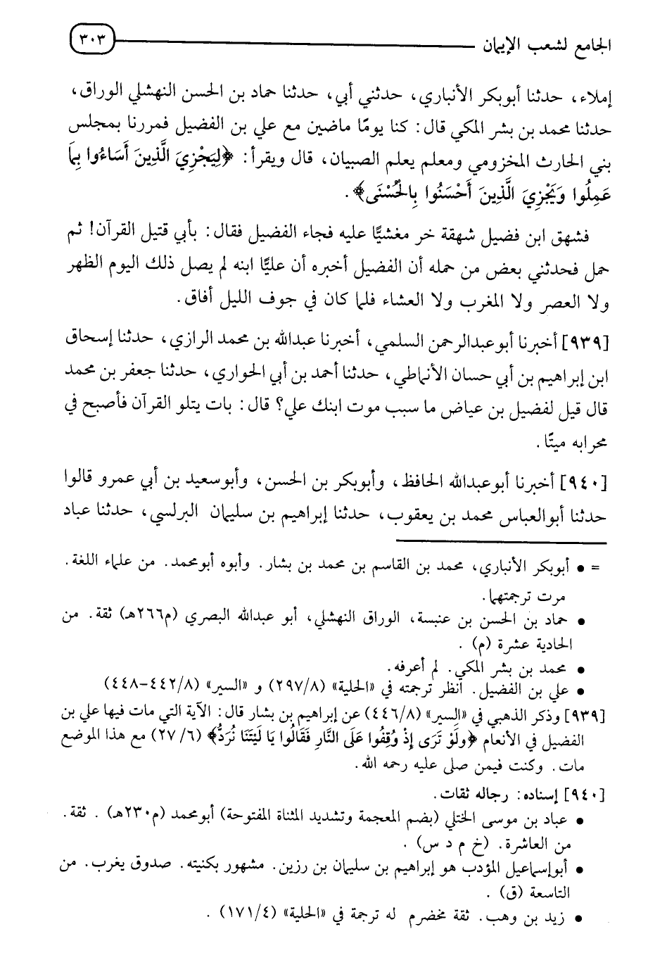 939 - أَخْبَرَنَا أَبُو عَبْدِ الرَّحْمَنِ السُّلَمِيُّ، أَخْبَرَنَا عَبْدُ اللهِ بْنُ مُحَمَّدٍ الرَّازِيُّ، حَدَّثَنَا إِسْحَاقُ بْنُ إِبْرَاهِيمَ بْنِ أَبِي حَسَّانَ الْأَنْمَاطِيُّ، حَدَّثَنَا أَحْمَدُ بْنُ أَبِي الْحَوَارِيِّ، حَدَّثَنَا جَعْفَرُ بْنُ مُحَمَّدٍ قَالَ: قِيلَ لِفُضَيْلِ بْنِ عِيَاضٍ مَا سَبَبُ مَوْتِ ابْنِكَ عَلِيٍّ قَالَ: §" بَاتَ يَتْلُو الْقُرْآنَ فَأَصْبَحَ فِي مِحْرَابِهِ مَيِّتًا "