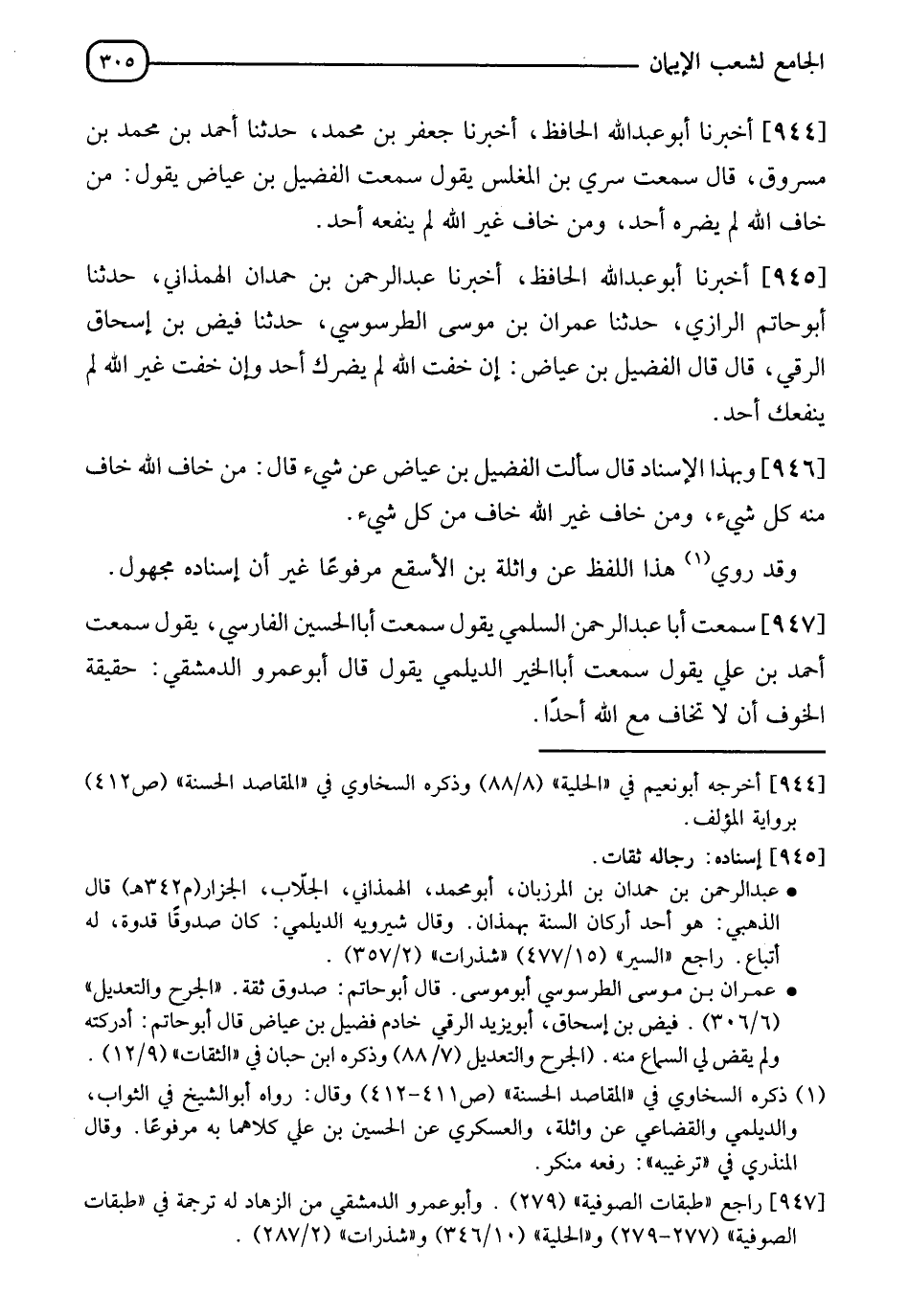 945 - أَخْبَرَنَا أَبُو عَبْدِ اللهِ الْحَافِظُ، أَخْبَرَنَا عَبْدُ الرَّحْمَنِ بْنُ حَمْدَانَ الْهَمْدَانِيُّ، حَدَّثَنَا أَبُو حَاتِمٍ الرَّازِيُّ، حَدَّثَنَا عِمْرَانُ بْنُ مُوسَى الطَّرَسُوسِيُّ، حَدَّثَنَا فَيْضُ بْنُ إِسْحَاقَ الرَّقِّيُّ، قَالَ: قَالَ الْفُضَيْلُ بْنُ عِيَاضٍ: إِنْ " §خِفْتَ اللهَ لَمْ يَضُرَّكَ أَحَدٌ، وَإِنْ خِفْتَ غَيْرَ اللهِ لَمْ يَنْفَعْكَ أَحَدٌ "