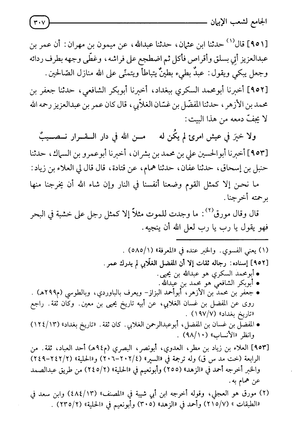952 - أَخْبَرَنَا أَبُو مُحَمَّدٍ السُّكَّرِيُّ، بِبَغْدَادَ أَخْبَرَنَا أَبُو بَكْرٍ الشَّافِعِيُّ، حَدَّثَنَا جَعْفَرُ بْنُ مُحَمَّدِ بْنِ الْأَزْهَرِ، حَدَّثَنَا الْمُفَضَّلُ بْنُ غَسَّانَ الْغَلَابِيُّ قَالَ:§" كَانَ عُمَرُ بْنُ عَبْدِ الْعَزِيزِ رَحِمَهُ اللهُ لَا يَجِفُّ دَمْعُهُ مِنْ هَذَا الْبَيْتِ: