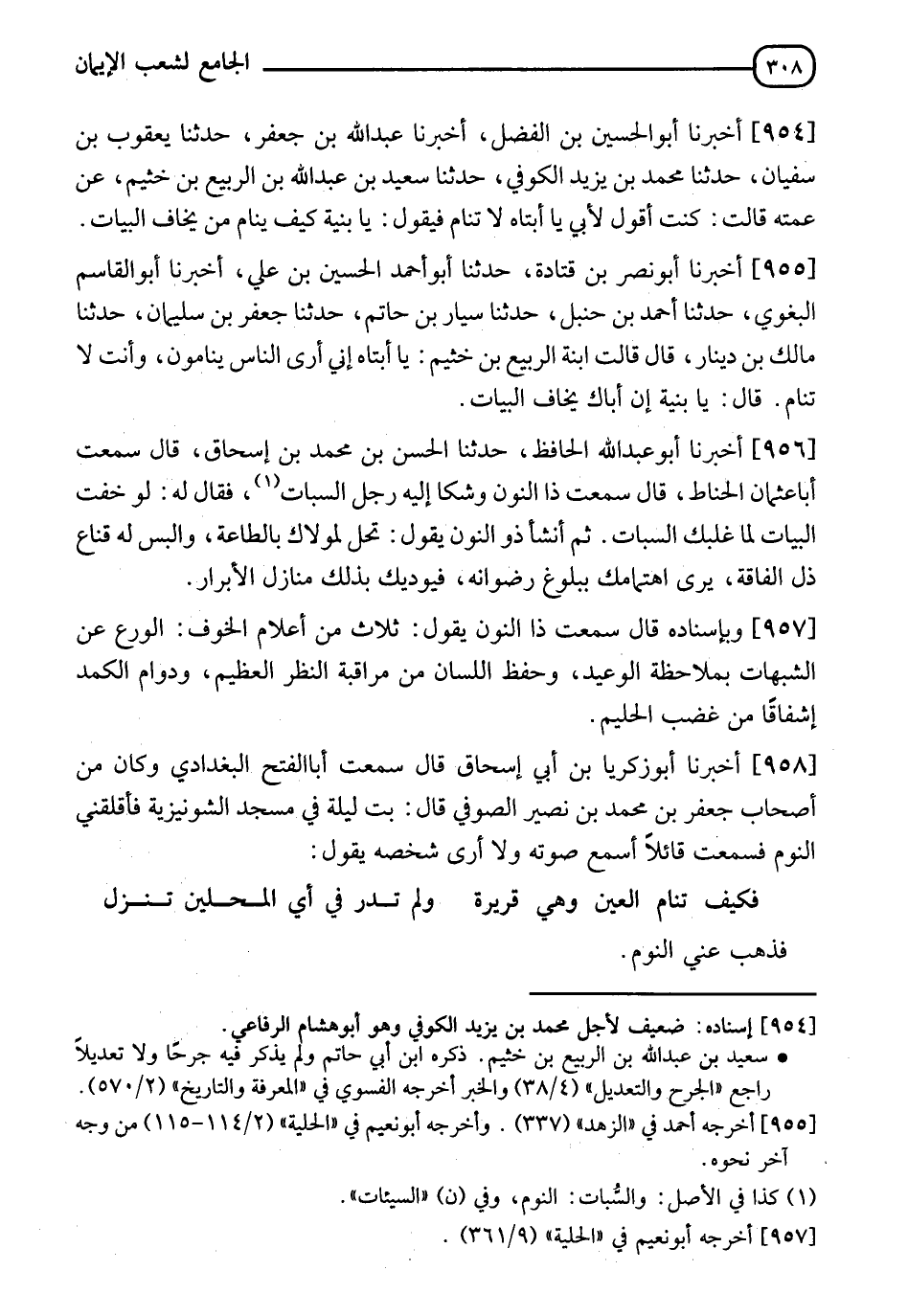 955 - أَخْبَرَنَا أَبُو نَصْرِ بْنُ قَتَادَةَ، حَدَّثَنَا أَبُو أَحْمَدَ الْحُسَيْنُ بْنُ عَلِيٍّ، أَخْبَرَنَا أَبُو الْقَاسِمِ الْبَغَوِيُّ، حَدَّثَنَا أَحْمَدُ بْنُ حَنْبَلٍ، حَدَّثَنَا سَيَّارُ بْنُ حَاتِمٍ، حَدَّثَنَا جَعْفَرُ بْنُ سُلَيْمَانَ، حَدَّثَنَا مَالِكُ بْنُ دِينَارٍ، قَالَ: قَالَتِ ابْنَةُ الرَّبِيعِ بْنِ خُثَيْمٍ: §" يَا أَبَتَاهُ إِنِّي أَرَى النَّاسَ يَنَامُونَ وَأَنْتَ لَا تَنَامُ؟ قَالَ: يَا بُنَيَّةُ إِنَّ أَبَاكِ يَخَافُ الْبَيَاتَ "