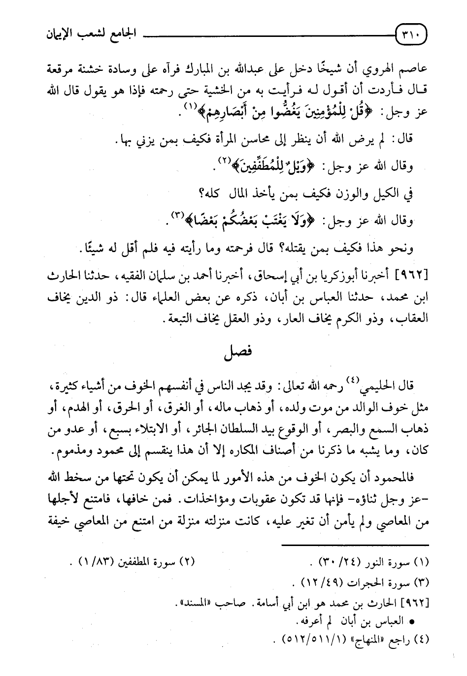 §فَصْلٌ قَالَ الْحَلِيمِيُّ رَحِمَهُ اللهُ تَعَالَى: وَقَدْ يَجِدُ النَّاسُ فِي أَنْفُسِهِمُ الْخَوْفَ مِنْ أَشْيَاءَ كَثِيرَةٍ، مِثْلَ خَوْفِ الْوَالِدِ مِنْ مَوْتِ وَلَدِهِ، أَوْ ذَهَابِ مَالِهِ، أَوِ الْغَرَقِ، أَوِ الْحَرْقِ، أَوِ الْهَدْمِ، أَوْ ذَهَابِ السَّمْعِ وَالْبَصَرِ، أَوِ الْوقُوعِ بِيَدِ السُّلْطَانِ الْجَائِرِ، أَوِ الِابْتِلَاءِ بِسَبُعٍ، أَوْ عَدُوٍّ مَنْ كَانَ، وَمَا يُشْبِهُ مَا ذَكَرْنَا مِنْ أَصْنَافِ الْمَكَارِهِ، إِلَّا أَنَّ هَذَا يَنْقَسِمُ إِلَى مَحْمُودٍ وَمَذْمُومٍ. فَالْمَحْمُودُ أَنْ يَكُونَ الْخَوْفُ مِنْ هَذِهِ الْأُمُورِ لِمَا يُمَكِنُ أَنْ يَكُونَ تَحْتَهَا مِنْ سَخَطِ اللهِ - عَزَّ وَجَلَّ ثَنَاءُهُ - فَإِنَّهَا قَدْ تَكُونُ عُقُوبَاتٍ وَمُؤَاخَذَاتٍ. فَمَنْ خَافَهَا، فَامْتَنَعَ لِأَجْلِهَا مِنَ الْمَعَاصِي وَلَمْ يَأْمَنْ أَنْ تغَيِّرَ عَلَيْهِ، كَانَتْ مَنْزِلَتُهُ مَنْزِلَةَ مَنِ امْتَنَعَ مِنَ الْمَعَاصِي خِيفَةَ