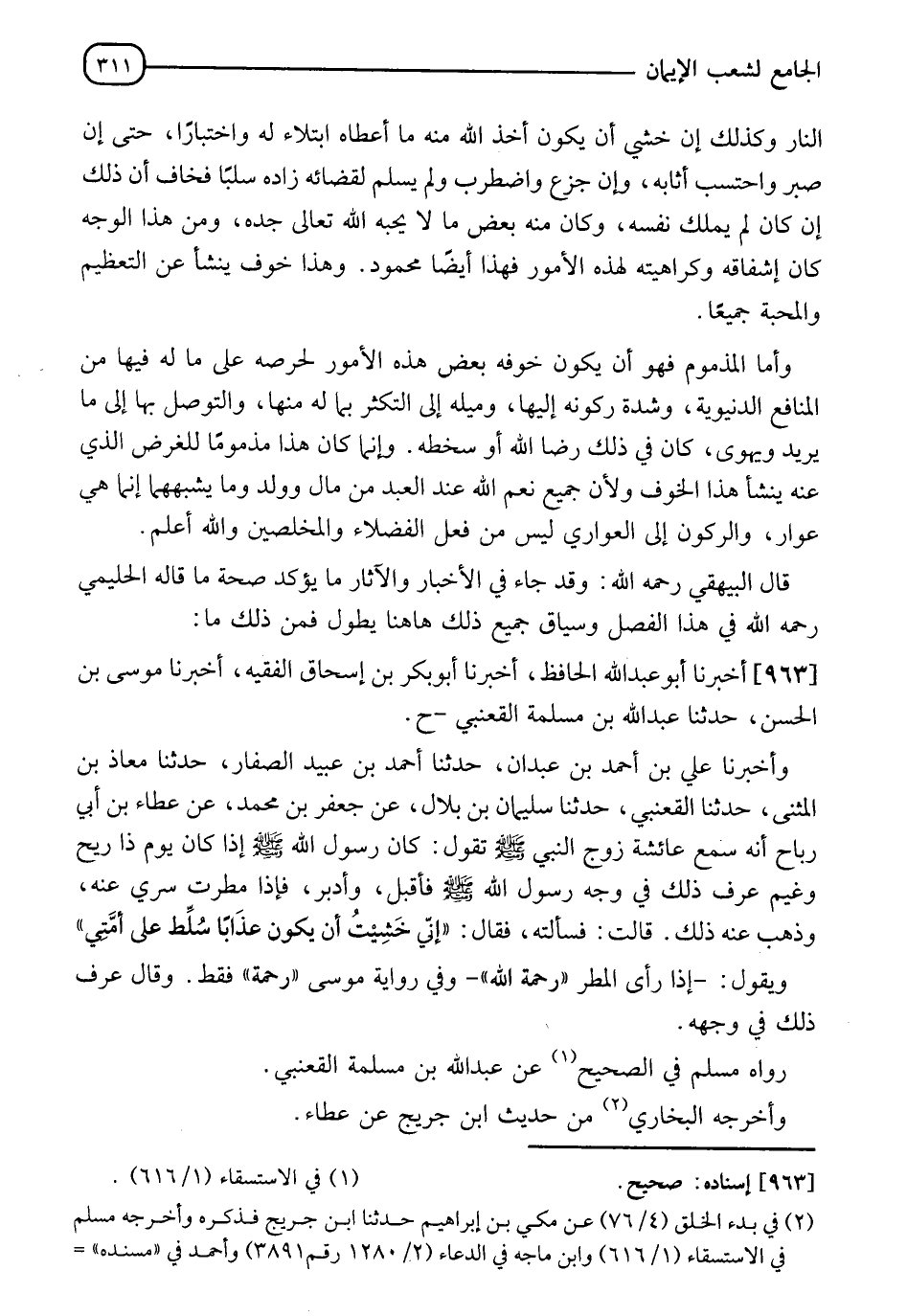 963 - أَخْبَرَنَا أَبُو عَبْدِ اللهِ الْحَافِظُ، أَخْبَرَنَا أَبُو بَكْرِ بْنُ إِسْحَاقَ الْفَقِيهُ، أَخْبَرَنَا مُوسَى بْنُ الْحَسَنِ، حَدَّثَنَا عَبْدُ اللهِ بْنُ مَسْلَمَةَ الْقَعْنَبِيُّ، ح وَأَخْبَرَنَا عَلِيُّ بْنُ أَحْمَدَ بْنِ عَبْدَانَ، حَدَّثَنَا أَحْمَدُ بْنُ عُبَيْدٍ الصَّفَّارُ، حَدَّثَنَا مُعَاذُ بْنُ الْمُثَنَّى، حَدَّثَنَا الْقَعْنَبِيُّ، حَدَّثَنَا سُلَيْمَانُ بْنُ بِلَالٍ، عَنْ جَعْفَرِ بْنِ مُحَمَّدٍ، عَنْ عَطَاءِ بْنِ أَبِي رَبَاحٍ، أَنَّهُ سَمِعَ عَائِشَةَ زَوْجَ النَّبِيِّ صَلَّى اللَّهُ عَلَيْهِ وَسَلَّمَ تَقُولُ: §" كَانَ رَسُولُ اللهِ صَلَّى اللَّهُ عَلَيْهِ وَسَلَّمَ إِذَا كَانَ يَوْمٌ ذَا رِيحٍ، وَغَيْمٍ عُرِفَ ذَلِكَ فِي وَجْهِ رَسُولِ اللهِ صَلَّى اللَّهُ عَلَيْهِ وَسَلَّمَ فأقبل وَأَدْبَرَ فَإِذَا مُطِرَتْ سُرِّيَ عَنْهُ، وَذَهَبَ عَنْهُ ذَلِكَ قَالَتْ: فَسَأَلْتُهُ فَقَالَ: إِنِّي خَشِيتُ أَنْ يَكُونَ عَذَابًا سُلِّطَ عَلَى أُمَّتِي " وَيَقُولُ - إِذَا رَأَى الْمَطَرَ -: " رَحْمَةُ اللهُ " وَفِي رِوَايَةِ مُوسَى: " رَحْمَةٌ "، فَقَطْ وَقَالَ: عُرِفَ ذَلِكَ فِي وَجْهِهِ. رَوَاهُ مُسْلِمٌ فِي الصَّحِيحِ عَنْ عَبْدِ اللهِ بْنِ مَسْلَمَةَ الْقَعْنَبِيِّ وَأَخْرَجَهُ الْبُخَارِيُّ مِنْ حَدِيثِ ابْنِ جُرَيْجٍ عَنْ عَطَاءٍ