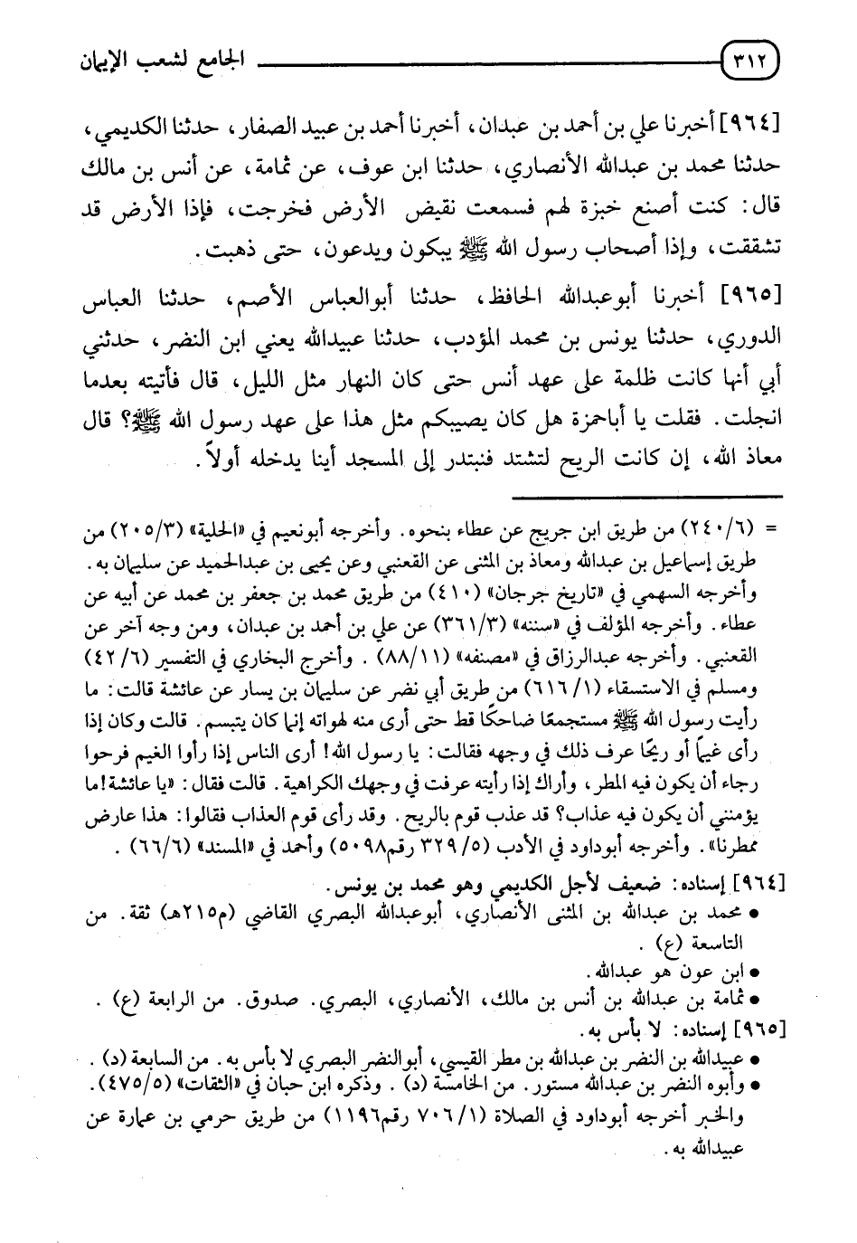 964 - أَخْبَرَنَا عَلِيُّ بْنُ أَحْمَدَ بْنِ عَبْدَانَ، أَخْبَرَنَا أَحْمَدُ بْنُ عُبَيْدٍ الصَّفَّارُ، حَدَّثَنَا الْكُدَيْمِيُّ، حَدَّثَنَا مُحَمَّدُ بْنُ عَبْدِ اللهِ الْأَنْصَارِيُّ، حَدَّثَنَا ابْنُ عَوْنٍ، عَنْ ثُمَامَةَ، عَنْ أَنَسِ بْنِ مَالِكٍ قَالَ: " §كُنْتُ أَصْنَعُ خُبْزَةً لَهُمْ فَسَمِعْتُ نَقِيضَ الْأَرْضِ، فَخَرَجْتُ فَإِذَا الْأَرْضُ قَدْ تَشَقَّقَتْ، وَإِذَا أَصْحَابُ رَسُولِ اللهِ صَلَّى اللَّهُ عَلَيْهِ وَسَلَّمَ يَبْكُونَ وَيَدْعُونَ حَتَّى ذَهَبَتْ "