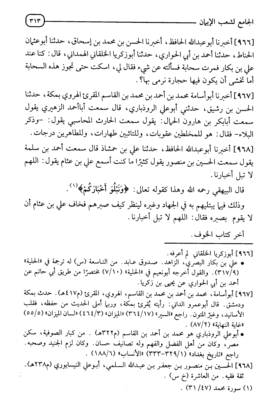 968 - أَخْبَرَنَا أَبُو عَبْدِ اللهِ الْحَافِظُ، حَدَّثَنَا عَلِيُّ بْنُ حَمْشَاذَ قَالَ: سَمِعْتُ أَحْمَدَ بْنَ سَلَمَةَ يَقُولُ: سَمِعْتُ الْحُسَيْنَ بْنَ مَنْصُورٍ يَقُولُ: كَثِيرًا مَا كُنْتُ أَسْمَعُ عَلِيَّ بْنَ عَثَّامٍ يَقُولُ: " §اللهُمَّ لَا تَبْلُ أَخْبَارَنَا " قَالَ الْبَيْهَقِيُّ رَحِمَهُ اللهُ: وَهَذَا كَقَوْلِهِ تَعَالَى {وَنَبْلُوَ أَخْبَارَكُمْ} [محمد: 31] وَذَلِكَ فِيمَا يَبْتَلِيهُمْ بِهِ فِي الْجِهَادِ وَغَيْرِهِ لِيَنْظُرَ كَيْفَ صَبْرُهُمْ فَخَافَ عَلِيُّ بْنُ عَثَّامٍ أَنْ لَا يَقُومَ بِصَبْرِهِ فَقَالَ: اللهُمَّ لَا تَبْلُ أَخْبَارَنَا