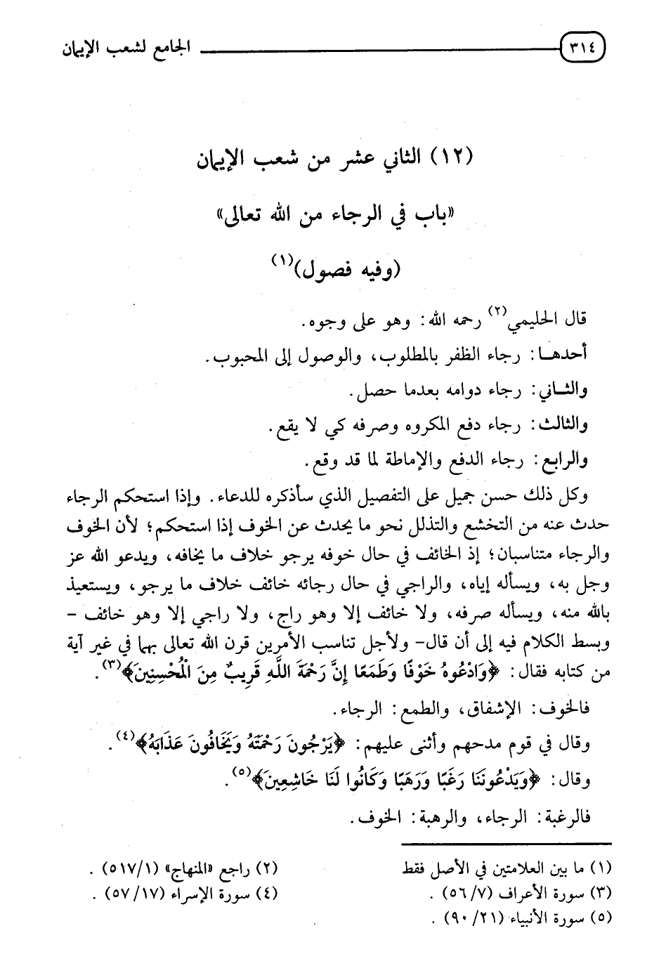 §الثَّاني عَشَرَ مِنْ شُعَبِ الْإِيمَانِ بَابٌ فِي الرَّجَاءِ مِنَ اللهِ تَعَالَى وَفِيهِ فُصُولٌ قَالَ الْحَلِيمِيُّ رَحِمَهُ اللهُ: " وَهُوَ عَلَى وُجُوهٍ أَحَدُهَا: رَجَاءُ الظَّفَرِ بِالْمَطْلُوبِ، وَالْوُصُولِ إِلَى الْمَحْبُوبِ وَالثَّانِي: رَجَاءُ دَوَامِهِ بَعْدَ مَا حَصَلَ، وَالثَّالِثُ: رَجَاءُ دَفْعِ الْمَكْرُوهِ وَصَرْفِهِ كَيْ لَا يَقَعَ، وَالرَّابِعُ: رَجَاءُ الدَّفْعِ وَالْإِمَاطَةِ لَمَا قَدْ وَقَعَ، وَكُلُّ ذَلِكَ حَسَنٌ جَمِيلٌ عَلَى التَّفْصِيلِ الَّذِي سَأَذْكُرُهُ لِلدُّعَاءِ، وَإِذَا اسْتَحْكَمَ الرَّجَاءُ حَدَثَ عَنْهُ مِنَ التَّخَشُّعِ وَالتَّذَلُّلِ نَحْوَ مَا يَحْدُثُ عَنِ الْخَوْفِ إِذَا اسْتَحْكَمَ، لِأَنَّ الْخَوْفَ وَالرَّجَاءَ مُتَنَاسِبَانِ، إِذِ الْخَائِفُ فِي حَالِ خَوْفِهِ يَرْجُو خِلَافَ مَا يَخَافُهُ، وَيَدْعُو اللهَ عَزَّ وَجَلَّ بِهِ، وَيَسْأَلُهُ إِيَّاهُ، وَالرَّاجِي فِي حَالِ رَجَائِهِ خَائِفٌ خلاف مَا يَرْجُو، وَيَسْتَعِيذُ بِاللهِ مِنْهُ، وَيَسْأَلُهُ صَرَفَهُ، وَلَا خَائِفَ إِلَّا وَهُوَ رَاجٍ، وَلَا رَاجِيَ إِلَّا وَهُوَ خَائِفٌ - وَبَسَطَ الْكَلَامَ فِيهِ إِلَى أَنْ قَالَ - وَلِأَجْلِ تَنَاسُبِ الْأَمْرَيْنِ قَرَنَ اللهُ تَعَالَى بِهِمَا فِي غَيْرِ آيَةٍ مِنْ كِتَابِهِ فَقَالَ: {وَادْعُوهُ خَوْفًا وَطَمَعًا إِنَّ رَحْمَةَ اللهِ قَرِيبٌ مِنَ الْمُحْسِنِينَ}: فَالْخَوْفُ: الْإِشْفَاقُ، وَالطَّمَعُ: الرَّجَاءُ، وَقَالَ فِي قَوْمٍ مَدَحَهُمْ وَأَثْنَى عَلَيْهِمْ: {يَرْجُونَ رَحْمَتَهُ وَيَخَافُونَ عَذَابَهُ} [الإسراء: 57] وَقَالَ: {وَيَدْعُونَنَا رَغَبًا وَرَهَبًا وَكَانُوا لَنَا خَاشِعِينَ} [الأنبياء: 90]: فَالرَّغْبَةُ: الرَّجَاءُ، وَالرَّهْبَةُ: الْخَوْفُ "