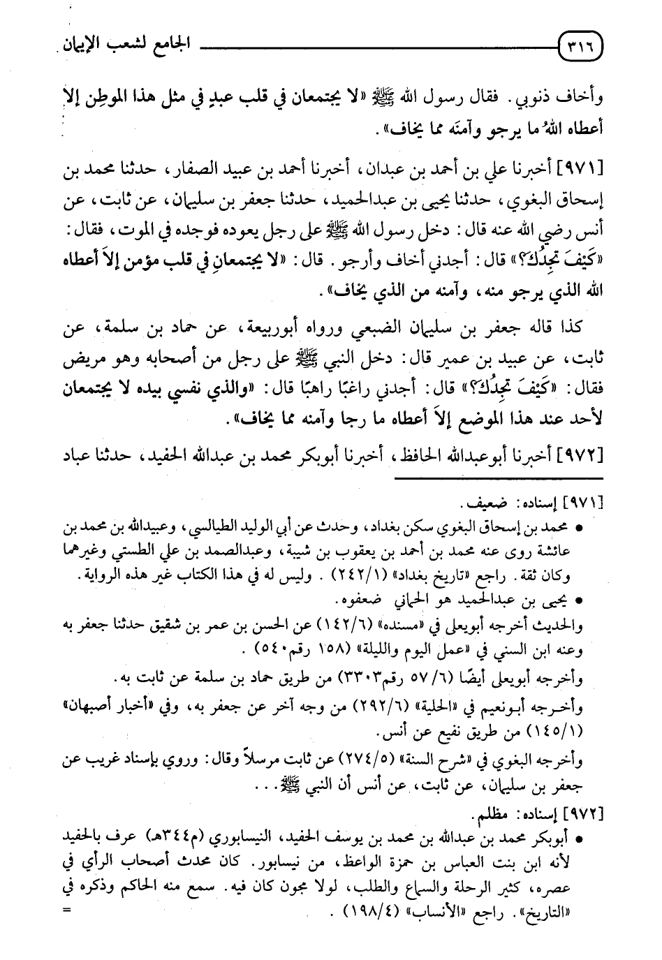 971 - أَخْبَرَنَا عَلِيُّ بْنُ أَحْمَدَ بْنِ عَبْدَانَ، أَخْبَرَنَا أَحْمَدُ بْنُ عُبَيْدٍ الصَّفَّارُ، حَدَّثَنَا مُحَمَّدُ بْنُ إِسْحَاقَ الْبَغَوِيُّ، حَدَّثَنَا يَحْيَى بْنُ عَبْدِ الْحَمِيدِ، حَدَّثَنَا جَعْفَرُ بْنُ سُلَيْمَانَ، عَنْ ثَابِتٍ، عَنْ أَنَسٍ رَضِيَ اللهُ عَنْهُ، قَالَ: دَخَلَ رَسُولُ اللهِ صَلَّى اللَّهُ عَلَيْهِ وَسَلَّمَ، عَلَى رَجُلٍ يَعُودُهُ فَوَجَدَهُ فِي الْمَوْتِ، فَقَالَ: " كَيْفَ تَجِدُكَ؟ " قَالَ: أَجِدُنِي أَخَافُ وَأَرْجُو، قَالَ: §" لَا يَجْتَمِعَانِ فِي قَلْبِ مُؤْمِنٍ إِلَّا أَعْطَاهُ اللهُ الَّذِي يَرْجُو مِنْهُ، وَأَمَّنَهُ مِنَ الَّذِي يَخَافُ " كَذَا قَالَهُ جَعْفَرُ بْنُ سُلَيْمَانَ الضُّبَعِيُّ