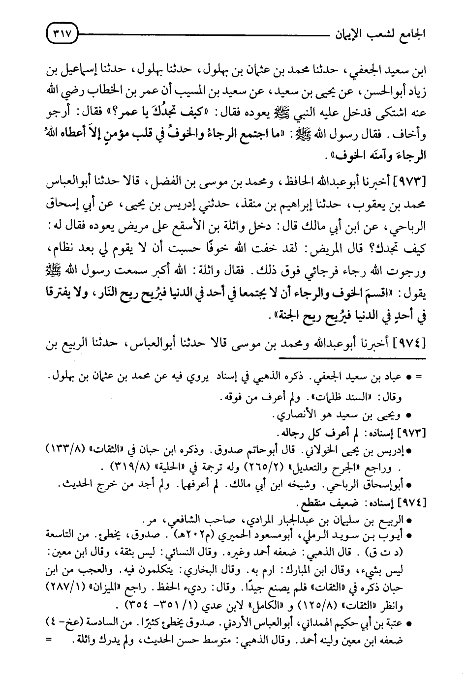 973 - أَخْبَرَنَا أَبُو عَبْدِ اللهِ الْحَافِظُ، وَمُحَمَّدُ بْنُ مُوسَى بْنِ الْفَضْلِ، قَالَا: حَدَّثَنَا أَبُو الْعَبَّاسِ مُحَمَّدُ بْنُ يَعْقُوبَ، حَدَّثَنَا إِبْرَاهِيمُ بْنُ مُنْقِذٍ، حَدَّثَنِي إِدْرِيسُ بْنُ يَحْيَى، عَنْ أَبِي إِسْحَاقَ الرِّبَاحِيِّ، عَنِ ابْنِ أَبِي مَالِكٍ، قَالَ: دَخَلَ وَاثِلَةُ بْنُ الْأَسْقَعِ عَلَى مَرِيضٍ يَعُودُهُ فَقَالَ لَهُ: كَيْفَ تَجِدُكَ؟ قَالَ الْمَرِيضُ: لَقَدْ خِفْتُ اللهَ خَوْفًا حسبت أَنْ لَا يَقُومَ لِي بَعْدُ نِظَامٌ، وَرَجَوْتُ اللهَ رَجَاءً فَرَجَائِي فَوْقَ ذَلِكَ، فَقَالَ وَاثِلَةُ: اللهُ أَكْبَرُ سَمِعْتُ رَسُولَ اللهِ صَلَّى اللَّهُ عَلَيْهِ وَسَلَّمَ يَقُولُ: " §أُقْسِمُ، الْخَوْفُ وَالرَّجَاءُ أَنْ لَا يَجْتَمِعَا فِي أَحَدٍ فِي الدُّنْيَا فَيُرَحْ رِيحَ النَّارَ، وَلَا يَفْتَرِقَا فِي أَحَدٍ فِي الدُّنْيَا فَيُرَيَّحْ رِيحَ الْجَنَّةِ "