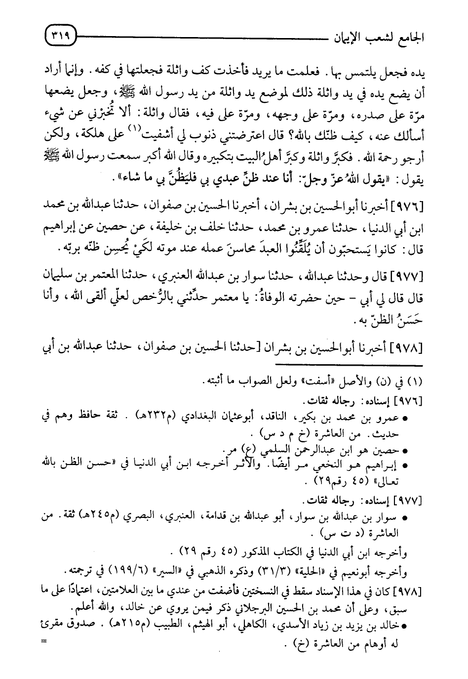 976 - أَخْبَرَنَا أَبُو الْحُسَيْنِ بْنُ بِشْرَانَ، أَخْبَرَنَا الْحُسَيْنُ بْنُ صَفْوَانَ، حَدَّثَنَا عَبْدُ اللهِ بْنُ مُحَمَّدِ بْنِ أَبِي الدُّنْيَا، حَدَّثَنَا عَمْرُو بْنُ مُحَمَّدٍ، حَدَّثَنَا خَلَفُ بْنُ خَلِيفَةَ، عَنْ حُصَيْنٍ، عَنْ إِبْرَاهِيمَ، قَالَ: " كَانُوا §يَسْتَحِبُّونَ أَنْ يُلَقِّنُوا، الْعَبْدَ مَحَاسِنَ عَمَلِهِ عِنْدَ مَوْتِهِ لِكَيْ يُحْسِنَ ظَنَّهُ بِرَبِّهِ "