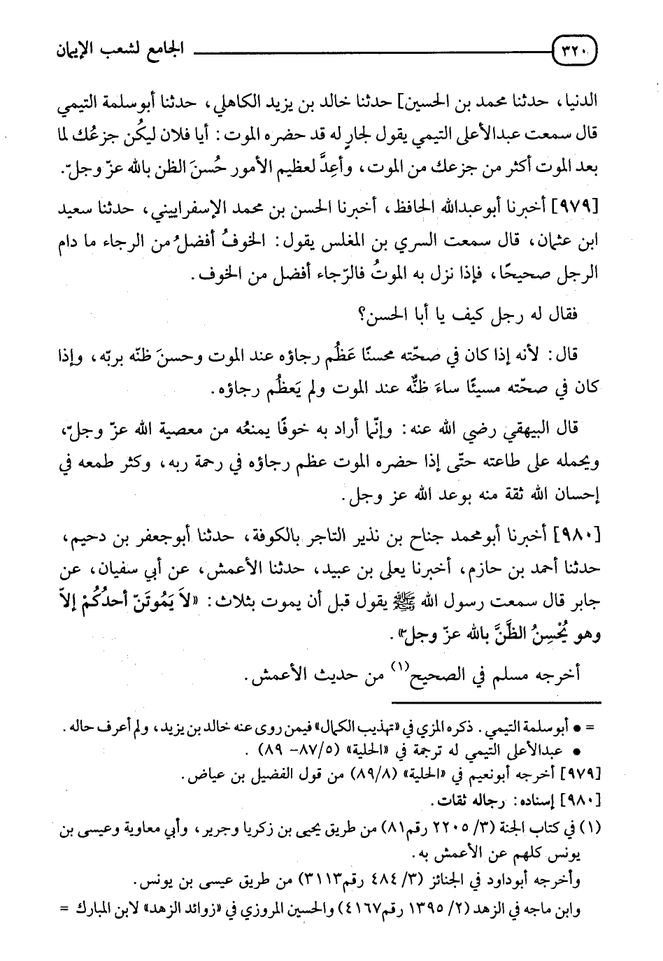 980 - أَخْبَرَنَا أَبُو مُحَمَّدٍ جَنَاحُ بْنُ نَذِيرٍ التَّاجِرُ بِالْكُوفَةِ، حَدَّثَنَا أَبُو جَعْفَرِ بْنُ دُحَيْمٍ، حَدَّثَنَا أَحْمَدُ بْنُ حَازِمٍ، أخبرنا يَعْلَى بْنُ عُبَيْدٍ، حَدَّثَنَا الْأَعْمَشُ، عَنْ أَبِي سُفْيَانَ، عَنْ جَابِرٍ، قَالَ: سَمِعْتُ رَسُولَ اللهِ صَلَّى اللَّهُ عَلَيْهِ وَسَلَّمَ يَقُولُ - قَبْلَ أَنْ يَمُوتَ بِثَلَاثٍ -: §" لَا يَمُوتَنَّ أَحَدُكُمْ إِلَّا وَهُوَ يُحْسِنُ الظَّنَّ بِاللهِ عَزَّ وَجَلَّ " أَخْرَجَهُ مُسْلِمٌ فِي الصَّحِيحِ مِنْ حَدِيثِ الْأَعْمَشِ -[321]- قَالَ الْبَيْهَقِيُّ رَحِمَهُ اللهُ: " وَأَفْضَلُ الرَّجَاءِ مَا تَوَلَّدَ مِنْ مُجَاهَدَةِ النَّفْسِ وَمُجَانَبَةِ الْهَوَى " قَالَ اللهُ عَزَّ وَجَلَّ: {إِنَّ الَّذِينَ آمَنُوا وَالَّذِينَ هَاجَرُوا وَجَاهَدُوا فِي سَبِيلِ اللهِ أُولَئِكَ يَرْجُونَ رَحْمَةَ اللهِ وَاللهُ غَفُورٌ رَحِيمٌ}