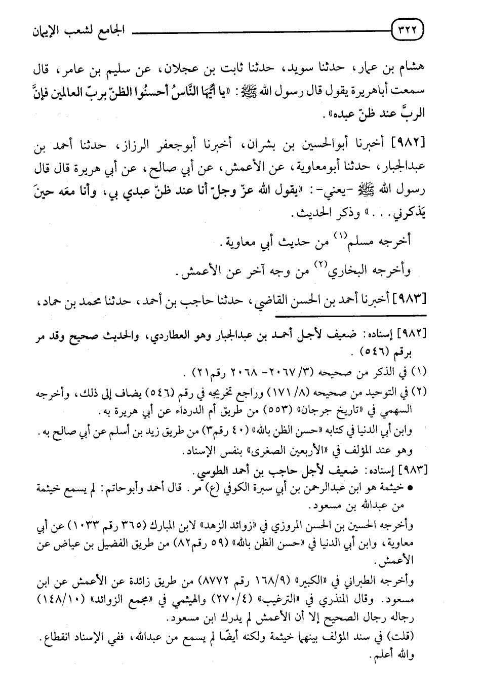 983 - أَخْبَرَنَا أَحْمَدُ بْنُ الْحَسَنِ الْقَاضِي، حَدَّثَنَا حَاجِبُ بْنُ أَحْمَدَ، حَدَّثَنَا مُحَمَّدُ بْنُ حَمَّادٍ، -[323]- حَدَّثَنَا أَبُو مُعَاوِيَةَ، عَنِ الْأَعْمَشِ، عَنْ خَيْثَمَةَ، قَالَ: قَالَ عَبْدُ اللهِ: " وَالَّذِي لَا إِلَهَ غَيْرُهُ §مَا أُعْطِيَ عَبْدٌ مُؤْمِنٌ شَيْئًا قَطُّ بَعْدَ الْإِيمَانِ بِاللهِ عَزَّ وَجَلَّ أَفْضَلَ مِنْ أَنْ يُحْسِنَ ظَنَّهُ بِاللهِ وَاللهِ الَّذِي لَا إِلَهَ غَيْرُهُ لَا يُحْسِنُ عَبْدٌ بِاللهِ ظَنَّهُ إِلَّا أَعْطَاهُ اللهُ إِيَّاهُ، وَذَلِكَ أَنَّ الْخَيْرَ بِيَدِهِ "