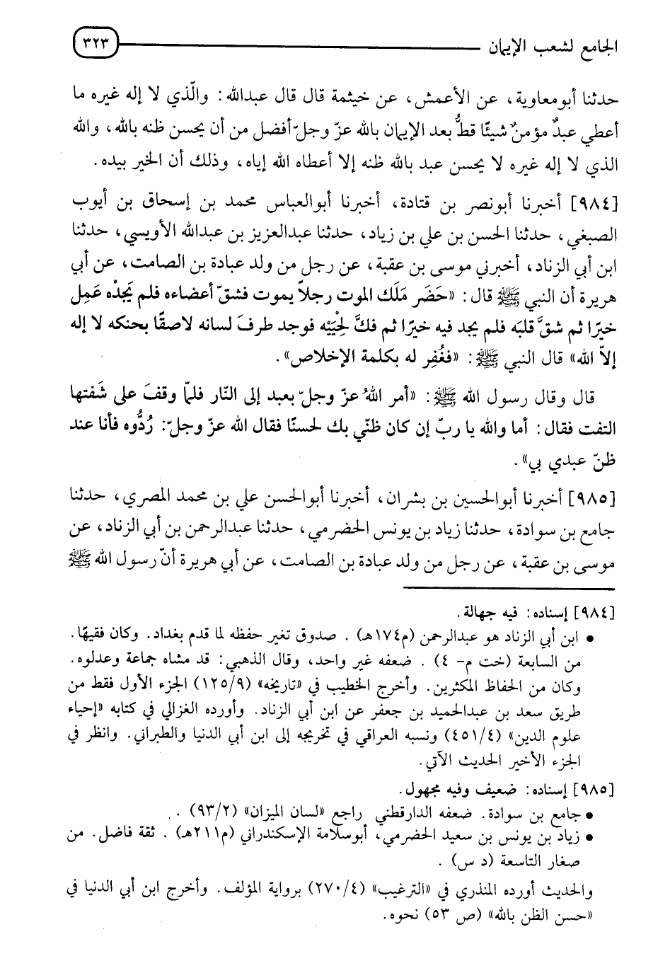 985 - أَخْبَرَنَا أَبُو الْحُسَيْنِ بْنُ بِشْرَانَ، أَخْبَرَنَا أَبُو الْحَسَنِ عَلِيُّ بْنُ مُحَمَّدٍ الْمِصْرِيُّ، حَدَّثَنَا جَامِعُ بْنُ سَوَادَةَ، حَدَّثَنَا زِيَادُ بْنُ يُونُسَ الْحَضْرَمِيُّ، حَدَّثَنَا عَبْدُ الرَّحْمَنِ بْنُ أَبِي الزِّنَادِ، عَنْ مُوسَى بْنِ عُقْبَةَ، عَنْ رَجُلٍ، مِنْ وَلَدِ عُبَادَةَ بْنِ الصَّامِتِ، عَنْ أَبِي هُرَيْرَةَ، أَنَّ رَسُولَ اللهِ صَلَّى اللَّهُ عَلَيْهِ وَسَلَّمَ -[324]- قَالَ: " أَمَرَ اللهُ عَزَّ وَجَلَّ بِعَبْدَيْنِ إِلَى النَّارِ فَلَمَّا وَقَفَ أَحَدُهُمَا عَلَى شَفَتِهَا الْتَفَتَ فَقَالَ: أَمَا وَاللهِ إِنْ كَانَ ظَنِّي بِكَ لَحَسَنٌ، فَقَالَ اللهُ عَزَّ وَجَلَّ: §رُدُّوهُ فَأَنَا عِنْدَ ظَنِّ عَبْدِي بِي فَغَفَرَ لَهُ " قَالَ الْبَيْهَقِيُّ رَحِمَهُ اللهُ: " وَقَدْ ذُكِرَ فِي حُسْنِ الظَّنِّ بِاللهِ تَعَالَى حِكَايَاتٌ فِي بَابِ التَّوْبَةِ فِي هَذَا الْكِتَابِ "