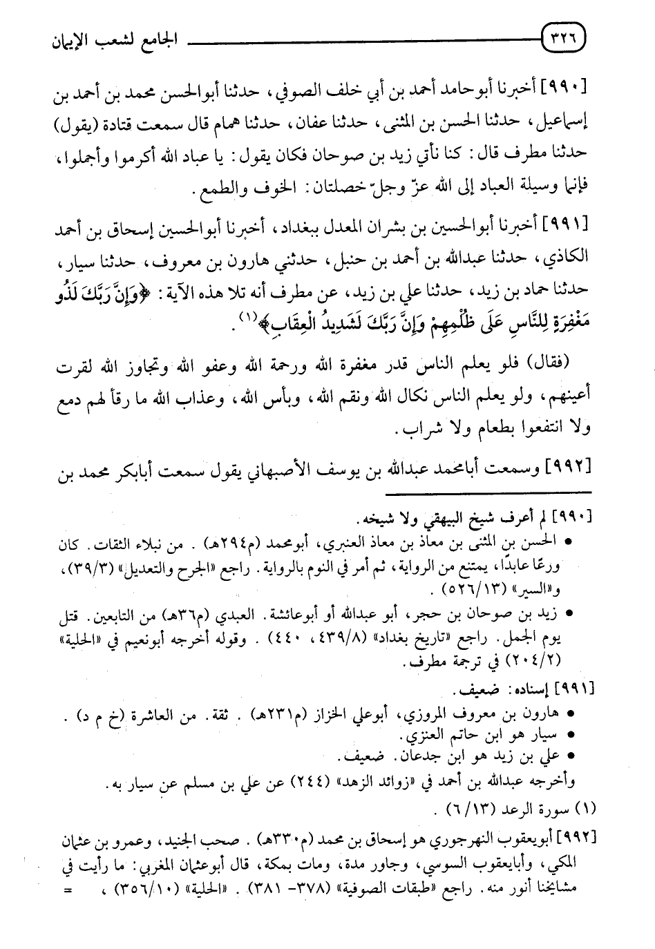 991 - أَخْبَرَنَا أَبُو الْحُسَيْنِ بْنُ بِشْرَانَ الْمُعَدِّلُ، بِبَغْدَادَ، أَخْبَرَنَا أَبُو الْحُسَيْنِ إِسْحَاقُ بْنُ أَحْمَدَ الْكَاذِيُّ، حَدَّثَنَا عَبْدُ اللهِ بْنُ أَحْمَدَ بْنِ حَنْبَلٍ، حَدَّثَنِي هَارُونُ بْنُ مَعْرُوفٍ، حَدَّثَنَا سَيَّارٌ، حَدَّثَنَا حَمَّادُ بْنُ زَيْدٍ، حَدَّثَنَا عَلِيُّ بْنُ زَيْدٍ، عَنْ مُطَرِّفٍ، أَنَّهُ تَلَا هَذِهِ الْآيَةَ: {وَإِنَّ رَبَّكَ لَذُو مَغْفِرَةٍ لِلنَّاسِ عَلَى ظُلْمِهِمْ وَإِنَّ رَبَّكَ لَشَدِيدُ الْعِقَابِ} [الرعد: 6] فَقَالَ: §" فَلَوْ يَعْلَمُ النَّاسُ قَدْرَ مَغْفِرَةِ اللهِ وَرَحْمَةِ اللهِ وَعَفْوِ اللهِ وَتَجَاوُزِ اللهِ لَقَرَّتْ أَعْيُنُهُمْ، وَلَوْ يَعْلَمُ النَّاسُ نَكَالَ اللهِ وَنِقَمَ اللهِ، وَبَأْسَ اللهِ، وَعَذَابَ اللهِ مَا رَقَأَ لَهُمْ دَمْعٌ وَلَا انْتَفَعُوا بِطَعَامٍ وَلَا شَرَابٍ "