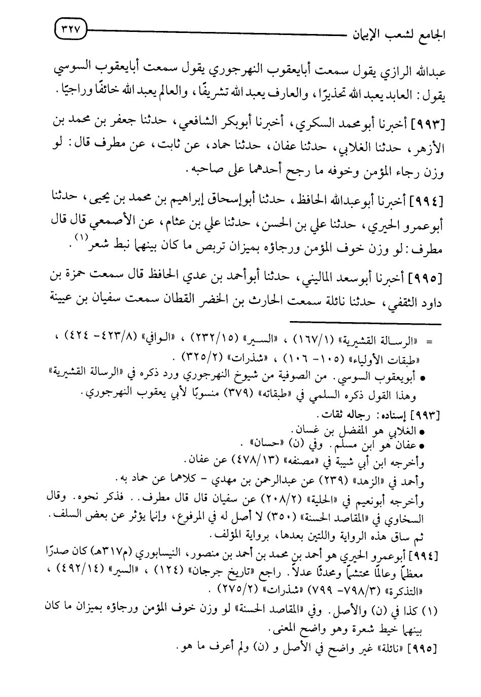 995 - أَخْبَرَنَا أَبُو سَعْدٍ الْمَالِينِيُّ، حَدَّثَنَا أَبُو أَحْمَدَ بْنُ عَدِيٍّ الْحَافِظُ، قَالَ: سَمِعْتُ حَمْزَةَ بْنَ دَاوُدَ الثَّقَفِيَّ، حَدَّثَنَا نائلة سَمِعْتُ الْحَارِثَ بْنَ الْخَضِرِ الْقَطَّانَ، سَمِعْتُ سُفْيَانَ بْنَ عُيَيْنَةَ، -[328]- سَمِعْتُ شُعْبَةَ، يَقُولُ: " §لَوْ وُزِنَ خَوْفُ الْمُؤْمِنِ وَرَجَاؤُهُ، مَا زَادَ خَوْفُهُ عَلَى رَجَائِهِ وَلَا رَجَاؤُهُ عَلَى خَوْفِهِ "