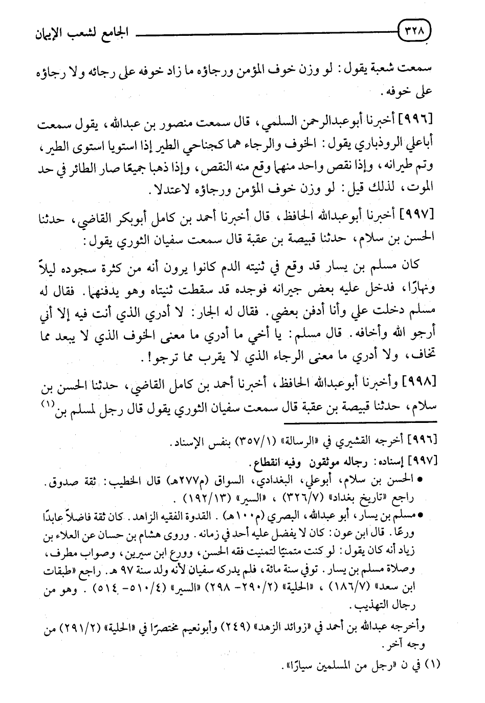 997 - أَخْبَرَنَا أَبُو عَبْدِ اللهِ الْحَافِظُ، قَالَ: أَخْبَرَنَا أَحْمَدُ بْنُ كَامِلٍ أَبُو بَكْرٍ الْقَاضِي، حَدَّثَنَا الْحَسَنُ بْنُ سَلَامٍ، حَدَّثَنَا قَبِيصَةُ بْنُ عُقْبَةَ، قَالَ: سَمِعْتُ سُفْيَانَ الثَّوْرِيَّ، يَقُولُ: كَانَ مُسْلِمُ بْنُ يَسَارٍ قَدْ وَقَعَ فِي ثَنِيَّتِهِ الدَّمُ كَانُوا يَرَوْنَ أَنَّهُ مِنْ كَثْرَةِ سُجُودِهِ لَيْلًا وَنَهَارًا، فَدَخَلَ عَلَيْهِ بَعْضُ جِيرَانِهِ فَوَجَدَهُ قَدْ سَقَطَتْ ثَنِيَّتَاهُ وَهُوَ يَدْفِنُهُمَا، فَقَالَ لَهُ مُسْلِمٌ: دَخَلْتَ عَلَيَّ وَأَنَا أَدْفِنَ بَعْضِي؟ فَقَالَ لَهُ الْجَارُ: لَا أَدْرِي الَّذِي أَنْتَ فِيهِ إِلَّا أَنِّي أَرْجُو اللهَ وَأَخَافُهُ، قَالَ مُسْلِمٌ: " يَا أَخِي §مَا أَدْرِي مَا مَعْنَى الْخَوْفِ الَّذِي لَا يُبْعِدُ مِمَّا تَخَافُ، وَلَا أَدْرِي مَا مَعْنَى الرَّجَاءِ الَّذِي لَا يُقَرِّبُ مِمَّا تَرْجُو؟ "