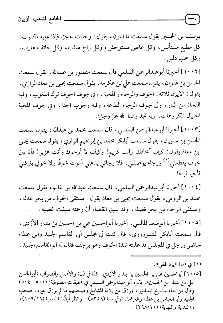 1002 - أَخْبَرَنَا أَبُو عَبْدِ الرَّحْمَنِ السَّلَمِيُّ، قَالَ: سَمِعْتُ مَنْصُورَ بْنَ عَبْدِ اللهِ، يَقُولُ: سَمِعْتُ الْحَسَنَ بْنَ عُلْوَانَ، يَقُولُ: سَمِعْتُ عَلِيَّ بْنَ عِكْرِمَةَ، يَقُولُ: سَمِعْتُ يَحْيَى بْنَ مُعَاذٍ الرَّازِيَّ، يَقُولُ: " الْإِيمَانُ ثَلَاثَةٌ: §الْخَوْفُ وَالرَّجَاءُ وَالْمَحَبَّةُ، وَفِي جَوْفِ الْخَوْفِ تَرْكُ الذُّنُوبِ، وَفِيهِ النَّجَاةُ مِنَ النَّارِ، وَفِي جَوْفِ الرَّجَاءِ الطَّاعَةُ، وَفِيهِ وُجُوبُ الْجَنَّةِ؛ وَفِي جَوْفِ الْمَحَبَّةِ احْتِمَالُ الْمَكْرُوهَاتِ، وَبِهِ تَجِدُ رِضَا اللهِ عَزَّ وَجَلَّ "