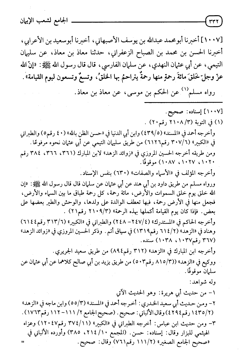 1007 - أَخْبَرَنَا أَبُو مُحَمَّدٍ عَبْدُ اللهِ بْنُ يُوسُفَ الْأَصْبَهَانِيُّ، أَخْبَرَنَا أَبُو سَعِيدِ بْنُ الْأَعْرَابِيِّ، أَخْبَرَنَا الْحَسَنُ بْنُ مُحَمَّدٍ الصَّبَّاحُ الزَّعْفَرَانِيُّ، حَدَّثَنَا مُعَاذُ بْنُ مُعَاذٍ، عَنْ سُلَيْمَانَ التَّيْمِيِّ، عَنْ أَبِي عُثْمَانَ النَّهْدِيِّ، عَنْ سَلْمَانَ الْفَارِسِيِّ، قَالَ: قَالَ رَسُولُ اللهِ صَلَّى اللَّهُ عَلَيْهِ وَسَلَّمَ: " إِنَّ §اللهَ عَزَّ وَجَلَّ خَلَقَ مِائَةَ رَحْمَةٍ مِنْهَا رَحْمَةٌ يَتَرَاحَمُ بِهَا الْخَلْقُ وَتِسْعٌ وَتِسْعُونَ لِيَوْمِ الْقِيَامَةِ " رَوَاهُ مُسْلِمٌ عَنِ الْحَكَمِ بْنِ مُوسَى، عَنْ مُعَاذِ بْنِ مُعَاذٍ