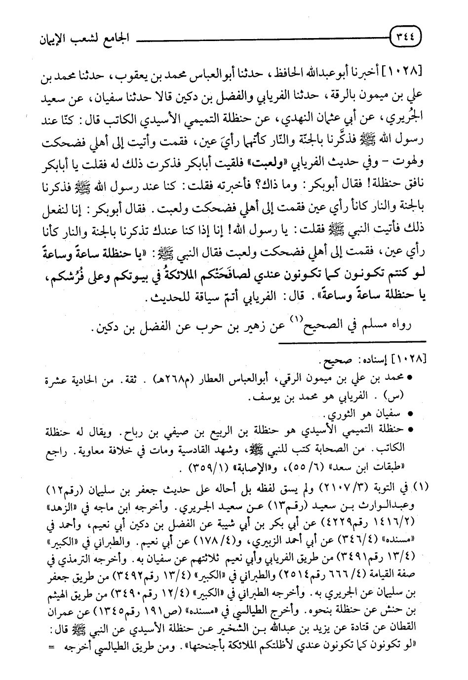1028 - أَخْبَرَنَا أَبُو عَبْدِ اللهِ الْحَافِظُ، حَدَّثَنَا أَبُو الْعَبَّاسِ مُحَمَّدُ بْنُ يَعْقُوبَ، حَدَّثَنَا مُحَمَّدُ بْنُ عَلِيِّ بْنِ مَيْمُونٍ، بِالرَّقَّةِ، حَدَّثَنَا الْفِرْيَابِيُّ، وَالْفَضْلُ بْنُ دُكَيْنٍ، قَالَا: حَدَّثَنَا سُفْيَانُ، عَنْ سَعِيدٍ الْجُرَيْرِيِّ، عَنْ أَبِي عُثْمَانَ النَّهْدِيِّ، عَنْ حَنْظَلَةَ التَّمِيمِيِّ الْأُسَيِّدِيِّ الْكَاتِبِ، قَالَ: كُنَّا عِنْدَ رَسُولِ اللهِ صَلَّى اللَّهُ عَلَيْهِ وَسَلَّمَ، فَذَكَّرَنَا بِالْجَنَّةِ وَالنَّارِ كَأَنَّهُمَا رَأْيُ عَيْنٍ، فَقُمْتُ وَأَتَيْتُ إِلَى أَهْلِي فَضَحِكْتُ وَلَهَوْتُ - وَفِي حَدِيثِ الْفِرْيَابِيِّ وَلَعِبْتُ - فَلَقِيتُ أَبَا بَكْرٍ، فَذَكَرْتُ ذَلِكَ لَهُ، فَقُلْتُ: يَا أَبَا بَكْرٍ، نَافَقَ حَنْظَلَةُ، فَقَالَ أَبُو بَكْرٍ: وَمَا ذَاكَ؟ فَأَخْبَرْتُهُ فَقُلْتُ: كُنَّا عِنْدَ رَسُولِ اللهِ صَلَّى اللَّهُ عَلَيْهِ وَسَلَّمَ، فَذَكَّرَنَا بِالْجَنَّةِ وَالنَّارِ كَأَنَّا رَأْيُ عَيْنٍ، فَقُمْتُ إِلَى أَهْلِي فَضَحِكِتُ وَلَعِبْتُ، فَقَالَ أَبُو بَكْرٍ: إِنَّا لَنَفْعَلُ ذَلِكَ فَأَتَيْتُ النَّبِيَّ صَلَّى اللَّهُ عَلَيْهِ وَسَلَّمَ، فَقُلْت: يَا رَسُولَ اللهِ، إِنَّا إِذَا كُنَّا عِنْدِكَ تُذَكِّرُنَا بِالْجَنَّةِ وَالنَّارِ كَأَنَّا رَأْيُ عَيْنٍ، فَقُمْتُ إِلَى أَهْلِي فَضَحِكْتُ وَلَعِبْتُ، فَقَالَ النَّبِيُّ صَلَّى اللَّهُ عَلَيْهِ وَسَلَّمَ: " يَا حَنْظَلَةُ §سَاعَةً وَسَاعَةً لَوْ كُنْتُمْ تَكُونُونَ كَمَا تَكُونُونَ عِنْدِي لَصَافَحَتْكُمُ الْمَلَائِكَةُ فِي بُيُوتِكُمْ وَعَلَى فُرُشِكُمْ، يَا حَنْظَلَةُ سَاعَةً وَسَاعَةً " قَالَ: الْفِرْيَابِيُّ أَتَمُّ سِيَاقَةً لِلْحَدِيثِ رَوَاهُ مُسْلِمٌ فِي الصَّحِيحِ عَنْ زُهَيْرِ بْنِ حَرْبٍ، عَنِ الْفَضْلِ بْنِ دُكَيْنٍ