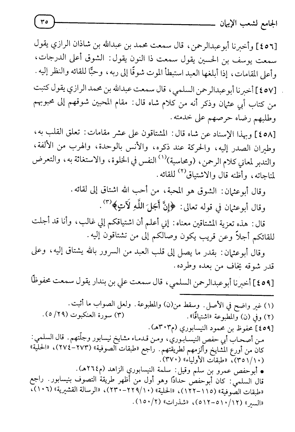 457 - أَخْبَرَنَا أَبُو عَبْدِ الرَّحْمَنِ السُّلَمِيُّ قَالَ: سَمِعْتُ عَبْدَ اللهِ بْنَ مُحَمَّدٍ الرَّازِيَّ يَقُولُ: كَتَبْتُ مِنْ كِتَابِ أَبِي عُثْمَانَ وَذَكَرَ أَنَّهُ مِنْ كَلَامِ شَاهٍ قَالَ: " §مَقَامُ الْمُحِبِّينَ شَوْقُهُمْ إِلَى مَحْبُوبِهِمْ، وَطَلَبُهُمْ رِضَاهُ حِرْصُهُمْ عَلَى خِدْمَتِهِ "
