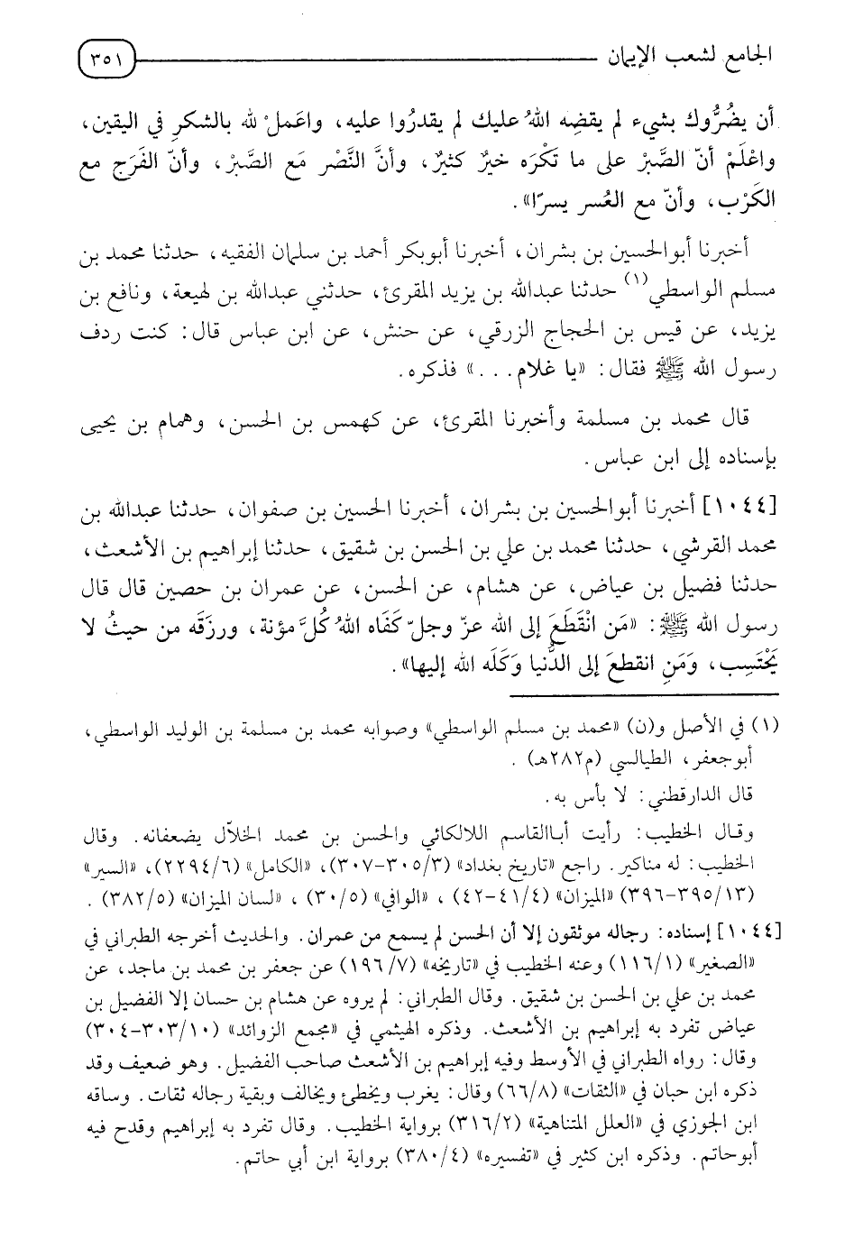 1044 - أَخْبَرَنَا أَبُو الْحُسَيْنِ بْنُ بِشْرَانَ، أَخْبَرَنَا الْحُسَيْنُ بْنُ صَفْوَانَ، حَدَّثَنَا عَبْدُ اللهِ بْنُ مُحَمَّدٍ الْقُرَشِيُّ، حَدَّثَنَا مُحَمَّدُ بْنُ عَلِيِّ بْنِ الْحَسَنِ بْنِ شَقِيقٍ، حَدَّثَنَا إِبْرَاهِيمُ بْنُ الْأَشْعَثِ، حَدَّثَنَا فُضَيْلُ بْنُ عِيَاضٍ، عَنْ هِشَامٍ، عَنِ الْحَسَنِ، عَنْ عِمْرَانَ بْنِ حُصَيْنٍ، قَالَ: قَالَ رَسُولُ اللهِ صَلَّى اللَّهُ عَلَيْهِ وَسَلَّمَ: §" مَنِ انْقَطَعَ إِلَى اللهِ عَزَّ وَجَلَّ كَفَاهُ اللهُ كُلَّ مُؤْنَةٍ، وَرَزَقَهُ مِنْ حَيْثُ لَا يَحْتَسِبُ، وَمَنِ انْقَطَعَ إِلَى الدُّنْيَا وَكَّلَهُ اللهُ إِلَيْهَا "