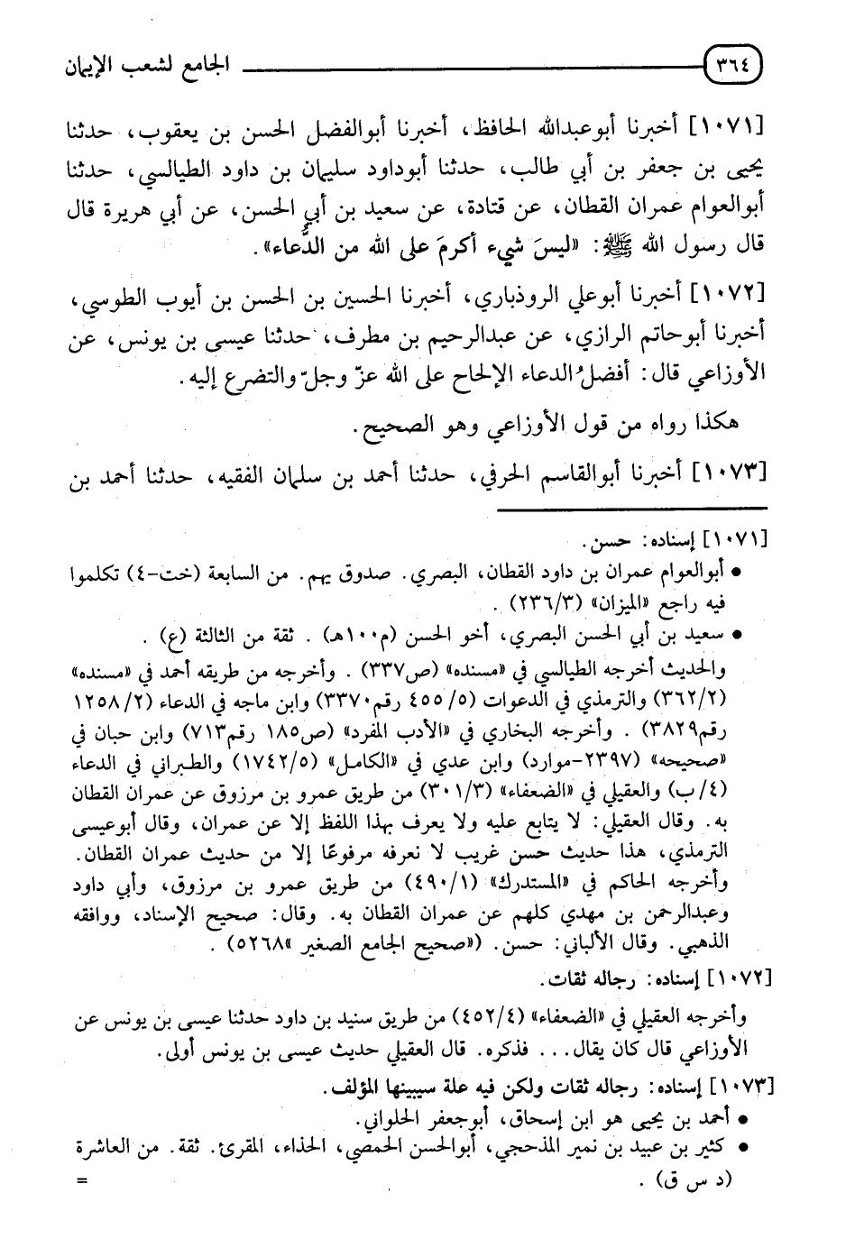 1071 - أَخْبَرَنَا أَبُو عَبْدِ اللهِ الْحَافِظُ، أَخْبَرَنَا أَبُو الْفَضْلِ الْحَسَنُ بْنُ يَعْقُوبَ، حَدَّثَنَا يَحْيَى بْنُ جَعْفَرِ بْنِ أَبِي طَالِبٍ، حَدَّثَنَا أَبُو دَاوُدَ سُلَيْمَانُ بْنُ دَاوُدَ الطَّيَالِسِيُّ، حَدَّثَنَا أَبُو الْعَوَّامِ عِمْرَانُ الْقَطَّانُ، عَنْ قَتَادَةَ، عَنْ سَعِيدِ بْنِ أَبِي الْحَسَنِ، عَنْ أَبِي هُرَيْرَةَ، قَالَ: قَالَ رَسُولُ اللهِ صَلَّى اللَّهُ عَلَيْهِ وَسَلَّمَ: §" لَيْسَ شَيْءٌ أَكْرَمَ عَلَى اللهِ مِنَ الدُّعَاءِ "