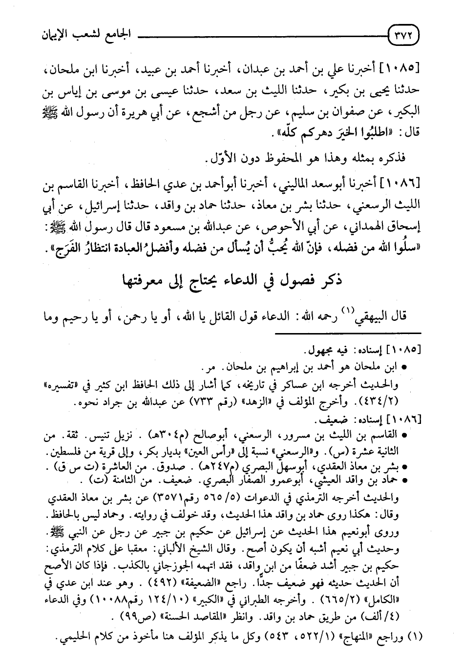 1086 - أَخْبَرَنَا أَبُو سَعْدٍ الْمَالِينِيُّ، أَخْبَرَنَا أَبُو أَحْمَدَ بْنُ عَدِيٍّ الْحَافِظُ، أَخْبَرَنَا الْقَاسِمُ بْنُ اللَّيْثِ الرَّسْعَنِيُّ، حَدَّثَنَا بِشْرُ بْنُ مُعَاذٍ، حَدَّثَنَا حَمَّادُ بْنُ وَاقِدٍ، حَدَّثَنَا إِسْرَائِيلُ، عَنْ أَبِي إِسْحَاقَ الْهَمْدَانِيِّ، عَنْ أَبِي الْأَحْوَصِ، عَنْ عَبْدِ اللهِ بْنِ مَسْعُودٍ، قَالَ: قَالَ رَسُولُ اللهِ صَلَّى اللَّهُ عَلَيْهِ وَسَلَّمَ: " §سَلُوا اللهَ مِنْ فَضْلِهِ، فَإِنَّ اللهَ يُحِبُّ أَنْ يُسْأَلَ مِنْ فَضْلِهِ، وَأَفْضَلُ الْعِبَادَةِ انْتِظَارُ الْفَرَجِ "