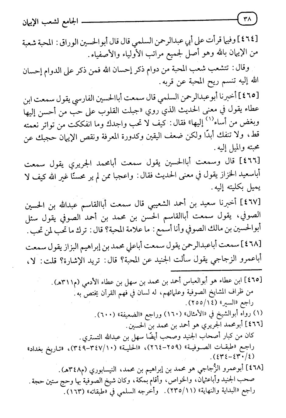 468 - سَمِعْتُ أَبَا عَبْدِ الرَّحْمَنِ يَقُولُ: سَمِعْتُ أَبَا عَلِيٍّ مُحَمَّدَ بْنَ إِبْرَاهِيمَ الْبَزَّازَ يَقُولُ: سَمِعْتُ أَبَا عَمْرٍو الزَّجَّاجِيَّ يَقُولُ: سَأَلْتُ الْجُنَيْدَ عَنِ الْمَحَبَّةِ قَالَ: " تُرِيدُ الْإِشَارَةَ؟ " قُلْتُ: لَا -[39]- قَالَ: " تُرِيدُ الدَّعْوَى؟ " قُلْتُ: لَا، قَالَ: " فَإِيشْ تُرِيدُ؟ " قُلْتُ: §عَيْنَ الْمَحَبَّةِ قَالَ: " أَنْ تُحِبَّ مَا يُحِبُّ اللهُ فِي عِبَادِهِ، وَتَكْرَهُ مَا يَكْرَهُ اللهُ فِي عِبَادِهِ "