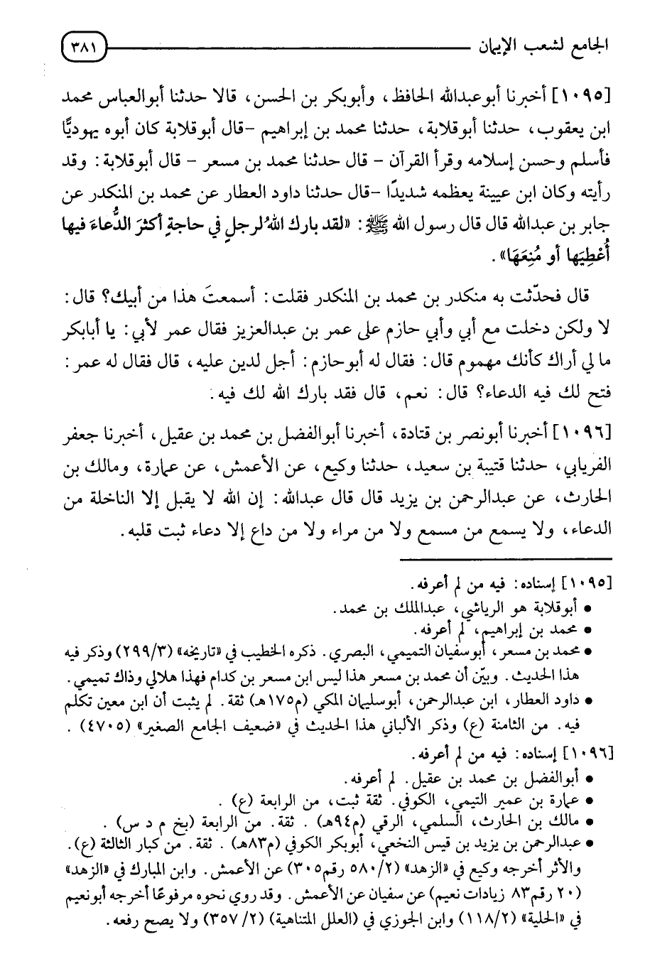 1095 - أَخْبَرَنَا أَبُو عَبْدِ اللهِ الْحَافِظُ، وَأَبُو بَكْرِ بْنُ الْحَسَنِ، قَالَا: حَدَّثَنَا أَبُو الْعَبَّاسِ مُحَمَّدُ بْنُ يَعْقُوبَ، حَدَّثَنَا أَبُو قِلَابَةَ، حَدَّثَنَا مُحَمَّدُ بْنُ إِبْرَاهِيمَ، - قَالَ أَبُو قِلَابَةَ: - كَانَ أَبُوهُ يَهُودِيًّا فَأَسْلَمَ وَحَسُنَ إِسْلَامُهُ وَقَرَأَ الْقُرْآنَ - قَالَ: حَدَّثَنَا مُحَمَّدُ بْنُ مِسْعَرٍ، - قَالَ أَبُو قِلَابَةَ: وَقَدْ رَأَيْتُهُ وَكَانَ ابْنُ عُيَيْنَةَ يُعَظِّمُهُ شَدِيدًا - قَالَ: حَدَّثَنَا دَاوُدُ الْعَطَّارُ، عَنْ مُحَمَّدِ بْنِ الْمُنْكَدِرِ، عَنْ جَابِرِ بْنِ عَبْدِ اللهِ، قَالَ: قَالَ رَسُولُ اللهِ صَلَّى اللَّهُ عَلَيْهِ وَسَلَّمَ: §" لَقَدْ بَارَكَ اللهُ لِرَجُلٍ فِي حَاجَةٍ أَكْثَرَ الدُّعَاءَ فِيهَا أُعْطِيَهَا أَوْ مُنِعَهَا " قَالَ: فَحَدَّثْتُ بِهِ مُنْكدِرَ بْنَ مُحَمَّدِ بْنِ الْمُنْكَدِرِ فَقُلْتُ: أَسَمِعْتَ هَذَا مِنْ أَبِيكَ؟ قَالَ: لَا وَلَكِنْ دَخَلْتُ مَعَ أَبِي وَأَبِي حَازِمٍ عَلَى عُمَرَ بْنِ عَبْدِ الْعَزِيزِ فَقَالَ عُمَرُ لِأَبِي: " يَا أَبَا بَكْرٍ، مَالِي أَرَاكَ كَأَنَّكَ مَهْمُومٌ؟ " قَالَ: فَقَالَ لَهُ أَبُو حَازِمٍ: أَجَلْ؛ لِدَيْنٍ عَلَيْهِ، قَالَ: فَقَالَ لَهُ عُمَرُ: " فُتِحَ لَكَ فِيهِ الدُّعَاءُ؟ " قَالَ: نَعَمْ، قَالَ: " فَقَدْ بَارِكَ اللهُ لَكَ فِيهِ "