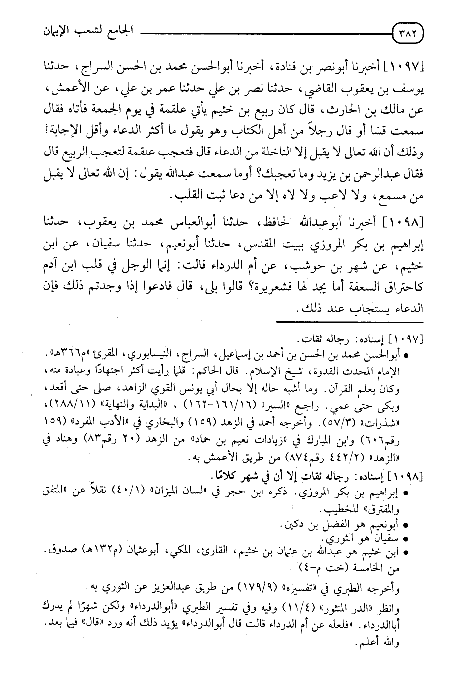 1097 - أَخْبَرَنَا أَبُو نَصْرِ بْنُ قَتَادَةَ، أَخْبَرَنَا أَبُو الْحَسَنِ مُحَمَّدُ بْنُ الْحَسَنِ السِّرَاجُ، حَدَّثَنَا يُوسُفُ بْنُ يَعْقُوبَ الْقَاضِي، حَدَّثَنَا نَصْرُ بْنُ عَلِيٍّ، حَدَّثَنَا عُمَرُ بْنُ عَلِيٍّ، عَنِ الْأَعْمَشِ، عَنْ مَالِكِ بْنِ الْحَارِثِ، قَالَ: كَانَ رَبِيعُ بْنُ خُثَيْمٍ يَأْتِي عَلْقَمَةَ فِي يَوْمِ الْجُمُعَةِ فَأَتَاهُ فَقَالَ: سَمِعْتُ قِسًّا أَوْ قَالَ رَجُلًا مِنْ أَهْلِ الْكِتَابِ وَهُوَ يَقُولُ: مَا أَكْثَرَ الدُّعَاءَ وَأَقَلَّ الْإِجَابَةَ وَذَلِكَ أَنَّ اللهَ تَعَالَى لَا يَقْبَلُ إِلَّا النَّاخِلَةَ مِنَ الدُّعَاءِ، قَالَ: فَتَعَجَّبَ عَلْقَمَةُ لِتَعَجُّبِ الرَّبِيعِ، قَالَ: فَقَالَ عَبْدُ الرَّحْمَنِ بْنُ يَزِيدَ: وَمَا تَعَجُّبُكَ؟ أَوَمَا سَمِعْتَ عَبْدَ اللهِ يَقُولُ: " إِنَّ §اللهَ تَعَالَى لَا يَقْبَلُ مِنْ مُسَمِّعٍ، وَلَا لَاعِبٍ وَلَا لَاهٍ إِلَّا مَنْ دَعَا ثَبْتَ الْقَلْبِ؟ "