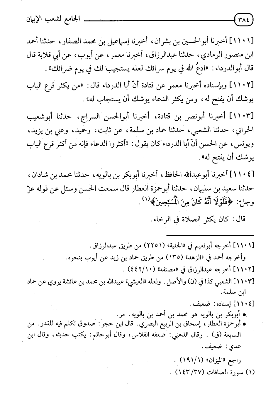 1104 - أَخْبَرَنَا أَبُو عَبْدِ اللهِ الْحَافِظُ، أَخْبَرَنَا أَبُو بَكْرِ بْنُ بَالَوَيْهِ، حَدَّثَنَا مُحَمَّدُ بْنُ شَاذَانَ، حَدَّثَنَا سَعِيدُ بْنُ سُلَيْمَانَ، حَدَّثَنَا أَبُو حَمْزَةَ الْعَطَّارُ، قَالَ: سَمِعْتُ الْحَسَنَ وَسُئِلَ عَنْ قَوْلِهِ عَزَّ وَجَلَّ: {فَلَوْلَا أَنَّهُ كَانَ مِنَ الْمُسَبِّحِينَ} [الصافات: 143] قَالَ: §" كَانَ يُكْثِرُ الصَّلَاةَ فِي الرَّخَاءِ "