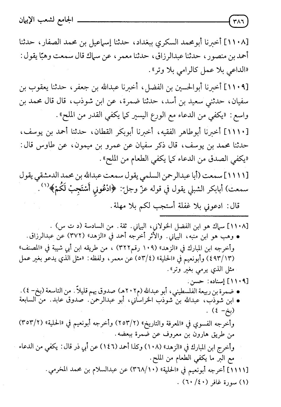 1111 - سَمِعْتُ أَبَا عَبْدِ الرَّحْمَنِ السَّلَمِيَّ، يَقُولُ: سَمِعْتُ عَبْدَ اللهِ بْنَ مُحَمَّدٍ الدِّمَشْقِيَّ، يَقُولُ: سَمِعْتُ أَبَا بَكْرٍ الشِّبْلِيَّ، يَقُولُ: فِي قَوْلِهِ عَزَّ وَجَلَّ: {ادْعُونِي أَسْتَجِبْ لَكُمْ} [غافر: 60] قَالَ: §" ادْعُونِي بِلَا غَفْلَةٍ أَسْتَجِبْ لَكُمْ بِلَا مُهْلَةٍ "