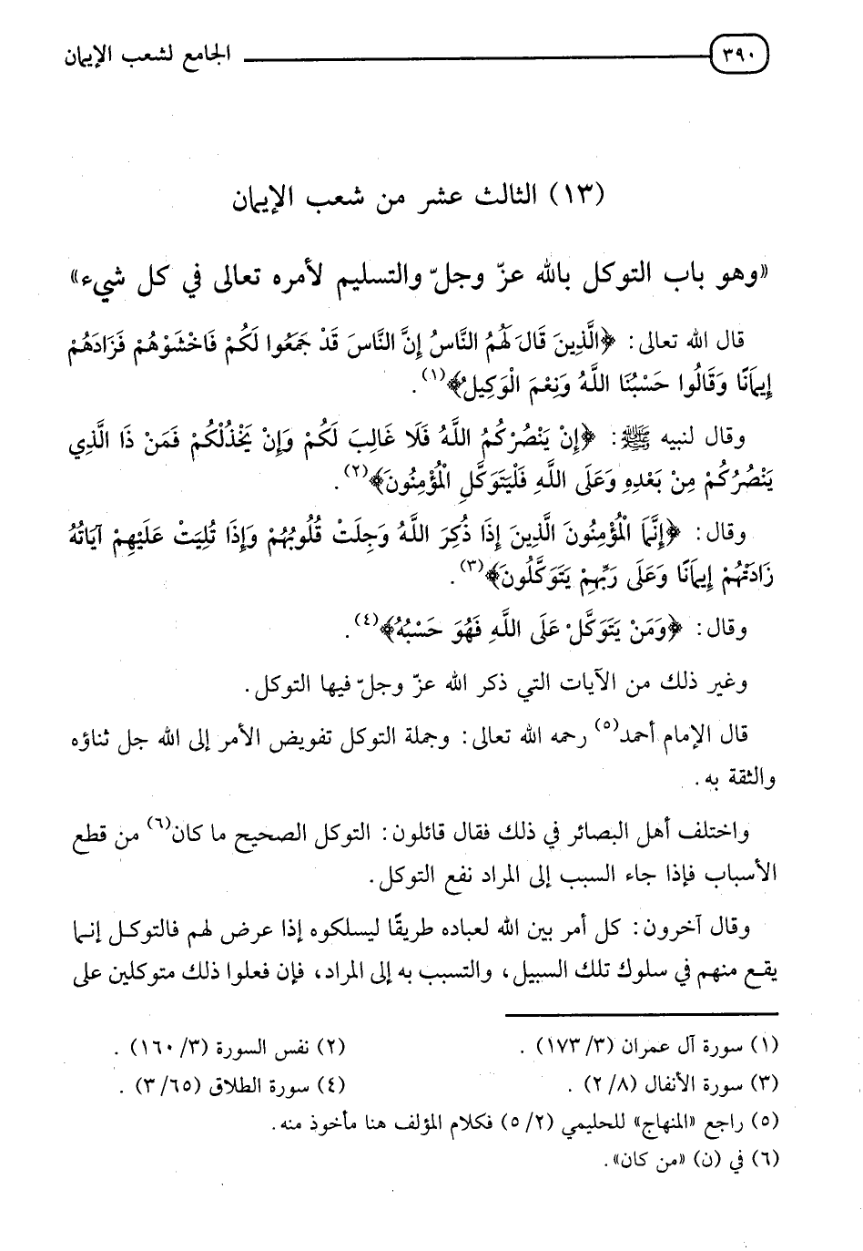 §الثَّالِثَ عَشَرَ مِنْ شُعَبِ الْإِيمَانِ " وَهُوَ بَابُ التَّوَكُّلِ بِاللهِ عَزَّ وَجَلَّ وَالتَّسْلِيمِ لَأَمْرِهِ تَعَالَى فِي كُلِّ شَيْءٍ " قَالَ اللهُ تَعَالَى: {الَّذِينَ قَالَ لَهُمُ النَّاسُ إِنَّ النَّاسَ قَدْ جَمَعُوا لَكُمْ فَاخْشَوْهُمْ فَزَادَهُمْ إِيمَانًا وَقَالُوا حَسْبُنَا اللهُ وَنِعْمَ الْوَكِيلُ} [آل عمران: 173]: وَقَالَ لِنَبِيِّهِ صَلَّى اللَّهُ عَلَيْهِ وَسَلَّمَ: {إِنْ يَنْصُرْكُمُ اللهُ فَلَا غَالِبَ لَكُمْ وَإِنْ يَخْذُلْكُمْ فَمَنْ ذَا الَّذِي يَنْصُرُكُمْ مِنْ بَعْدِهِ وَعَلَى اللهِ فَلْيَتَوَكَّلِ الْمُؤْمِنُونَ} [آل عمران: 160]: وَقَالَ: {إِنَّمَا الْمُؤْمِنُونَ الَّذِينَ إِذَا ذُكِرَ اللهُ وَجِلَتْ قُلُوبُهُمْ وَإِذَا تُلِيَتْ عَلَيْهِمْ آيَاتُهُ زَادَتْهُمْ إِيمَانًا وَعَلَى رَبِّهِمْ يَتَوَكَّلُونَ} [الأنفال: 2]، وَقَالَ: {وَمَنْ يَتَوَكَّلْ عَلَى اللهِ فَهُوَ حَسْبُهُ} [الطلاق: 3] وَغَيْرَ ذَلِكَ مِنَ الْآيَاتِ الَّتِي ذَكَرَ اللهُ عَزَّ وَجَلَّ فِيهَا التَّوَكُّلَ، قَالَ الْإِمَامُ أَحْمَدُ رَحِمَهُ اللهُ تَعَالَى: وجُمْلَةُ التَّوَكُّلِ تَفْوِيضُ الْأَمْرِ إِلَى اللهِ جَلَّ ثَنَاؤُهُ وَالثِّقَةُ بِهِ، وَاخْتَلَفَ أَهْلُ الْبَصَائِرِ فِي ذَلِكَ فَقَالَ قَائِلُونَ: التَّوَكُّلُ الصَّحِيحُ مَا كَانَ مِنْ قَطْعِ الْأَسْبَابِ فَإِذَا جَاءَ السَّبَبُ إِلَى الْمُرَادِ نَفَعَ التَّوَكُّلُ، وَقَالَ آخَرُونَ: كُلُّ أَمْرٍ بَيَّنَ اللهُ لِعِبَادِهِ طَرِيقًا لِيَسْلُكُوهُ إِذَا عَرَضَ لَهُمْ فَالتَّوَكُّلُ إِنَّمَا يَقَعُ مِنْهُمْ فِي سُلُوكِ تِلْكِ السَّبِيلِ، وَالتَّسَبُّبُ بِهِ إِلَى الْمُرَادِ؛ فَإِنْ فَعَلُوا ذَلِكَ مُتَوَكِّلِينَ عَلَى