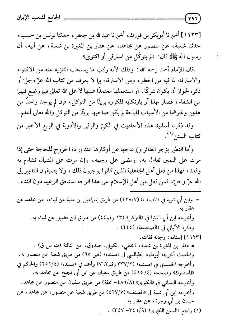 1123 - أَخْبَرَنَا أَبُو بَكْرِ بْنُ فُورَكٍ، أَخْبَرَنَا عَبْدُ اللهِ بْنُ جَعْفَرٍ، حَدَّثَنَا يُونُسُ بْنُ حَبِيبٍ، حَدَّثَنَا شُعْبَةُ، عَنْ مَنْصُورٍ، عَنْ مُجَاهِدٍ، عَنْ عَقَّارِ بْنِ الْمُغِيرَةِ بْنِ شُعْبَةَ، عَنْ أَبِيهِ، أَنَّ رَسُولَ اللهِ صَلَّى اللَّهُ عَلَيْهِ وَسَلَّمَ قَالَ: §" لَمْ يَتَوَكَّلْ مَنِ اسْتَرْقَى أَوِ اكْتَوَى " قَالَ الْإِمَامُ أَحْمَدُ رَحِمَهُ اللهُ: " وَذَلِكَ لِأَنَّهُ رَكِبَ مَا يُسْتَحَبُّ التَّنْزِيهُ عَنْهُ مِنَ الِاكْتِوَاءِ وَالِاسْتِرْقَاءِ لِمَا فِيهِ مِنَ الْخَطَرِ، وَمِنَ الِاسْتِرْقَاءِ بِمَا لَا يُعْرَفُ مِنْ كِتَابِ اللهِ عَزَّ وَجَلَّ أَوْ ذِكْرِهِ؛ لِجَوازِ أَنْ يَكُونَ شِرْكًا، أَوِ اسْتَعْمَلَهَا مُعْتَمِدًا عَلَيْهَا لَا عَلَى اللهِ تَعَالَى فِيمَا وَضَعَ فِيهِمَا مِنَ الشِّفَاءِ، فَصَارَ بِهَذَا أَوْ بِارْتِكَابِهِ الْمَكْرُوهَ بَرِيئًا مِنَ التَّوَكُّلِ، فَإِنْ لَمْ يُوجَدْ وَاحِدٌ مِنْ هَذَيْنِ وَغَيْرِهِمَا مِنَ الْأَسْبَابِ الْمُبَاحَةِ لَمْ يَكُنْ صَاحِبُهَا بَرِيئًا مِنَ التَّوَكُّلِ، وَاللهُ تَعَالَى أَعْلَمُ، وَقَدْ ذَكَرْنَا أَسَانِيدَ هَذِهِ الْأَحَادِيثِ فِي الْكَيِّ وَالرُّقَى وَالْأَدْوِيَةِ فِي الرُّبْعِ الْأَخِيرِ مِنْ كِتَابِ السُّنَنِ، وَأَمَّا التَّطَيُّرُ بِزَجْرِ الطَّائِرِ وَإِزْعَاجِهَا عَنْ أَوْكَارِهَا عِنْدَ إِرَادَةِ الْخُرُوجِ لِلْحَاجَةِ حَتَّى إِذَا مَرَّتْ عَلَى الْيَمِينِ تَفَاءَلَ بِهِ وَمَضَى عَلَى وَجْهِهِ، وَإِنْ مَرَّتْ عَلَى الشِّمَالِ تَشَاءَمَ بِهِ وَقَعَدَ، فَهَذَا مِنْ فِعْلِ أَهْلِ الْجَاهِلِيَّةِ الَّذِين كَانُوا يُوجِبُونَ ذَلِكَ، وَلَا يُضِيفُونَ التَّدْبِيرَ إِلَى اللهِ عَزَّ وَجَلَّ، فَمَنْ فِعْلَ مِنْ أَهْلِ الْإِسْلَامِ عَلَى هَذَا الْوَجْهِ اسْتَحَقَّ الْوَعِيدَ دُونَ الثَّنَاءِ "