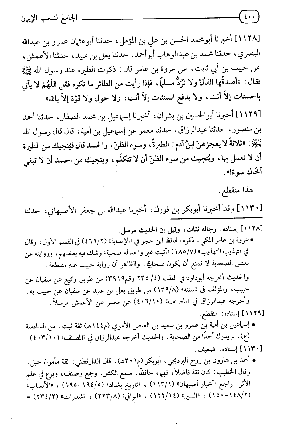 1128 - أَخْبَرَنَا أَبُو مُحَمَّدٍ الْحَسَنُ بْنُ عَلِيِّ بْنِ الْمُؤَمَّلِ، حَدَّثَنَا أَبُو عُثْمَانَ عَمْرُو بْنُ عَبْدِ اللهِ الْبَصْرِيُّ، حَدَّثَنَا مُحَمَّدُ بْنُ عَبْدِ الْوَهَّابِ أَبُو أَحْمَدَ، حَدَّثَنَا يَعْلَى بْنُ عُبَيْدٍ، حَدَّثَنَا الْأَعْمَشُ، عَنْ حَبِيبِ بْنِ أَبِي ثَابِتٍ، عَنْ عُرْوَةَ بْنِ عَامِرٍ، قَالَ: ذُكِرَتِ الطِّيَرَةُ عِنْدَ رَسُولِ اللهِ صَلَّى اللَّهُ عَلَيْهِ وَسَلَّمَ فَقَالَ: " §أَصْدَقُهَا الْفَالُ وَلَا تَرُدُّ مُسْلِمًا، فَإِذَا رَأَيْتَ مِنَ الطَّائِرِ مَا تَكْرَهُ، فَقُلِ: اللهُمَّ لَا يَأْتِي بِالْحَسَنَاتِ إِلَّا أَنْتَ، وَلَا يَدْفَعُ السَّيِّئَاتِ إِلَّا أَنْتَ، وَلَا حَوْلَ وَلَا قُوَّةَ إِلَّا بِاللهِ "