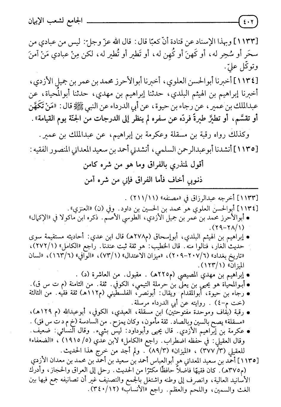 1133 - وَبِهَذَا الْإِسْنَادِ، عَنْ قَتَادَةَ، أَنَّ كَعْبًا، قَالَ: قَالَ اللهُ عَزَّ وَجَلَّ: " §لَيْسَ مِنْ عِبَادِي مَنْ سَحَرَ أَوْ سُحِرَ لَهُ، أَوْ كَهِنَ أَوْ كُهِنَ لَهُ، أَوْ تَطَيَّرَ أَوْ تُطُيِّرَ لَهُ، لَكِنَّ مِنْ عِبَادِي مَنْ آمَنَ وَتَوَكَّلَ عَلَيَّ "