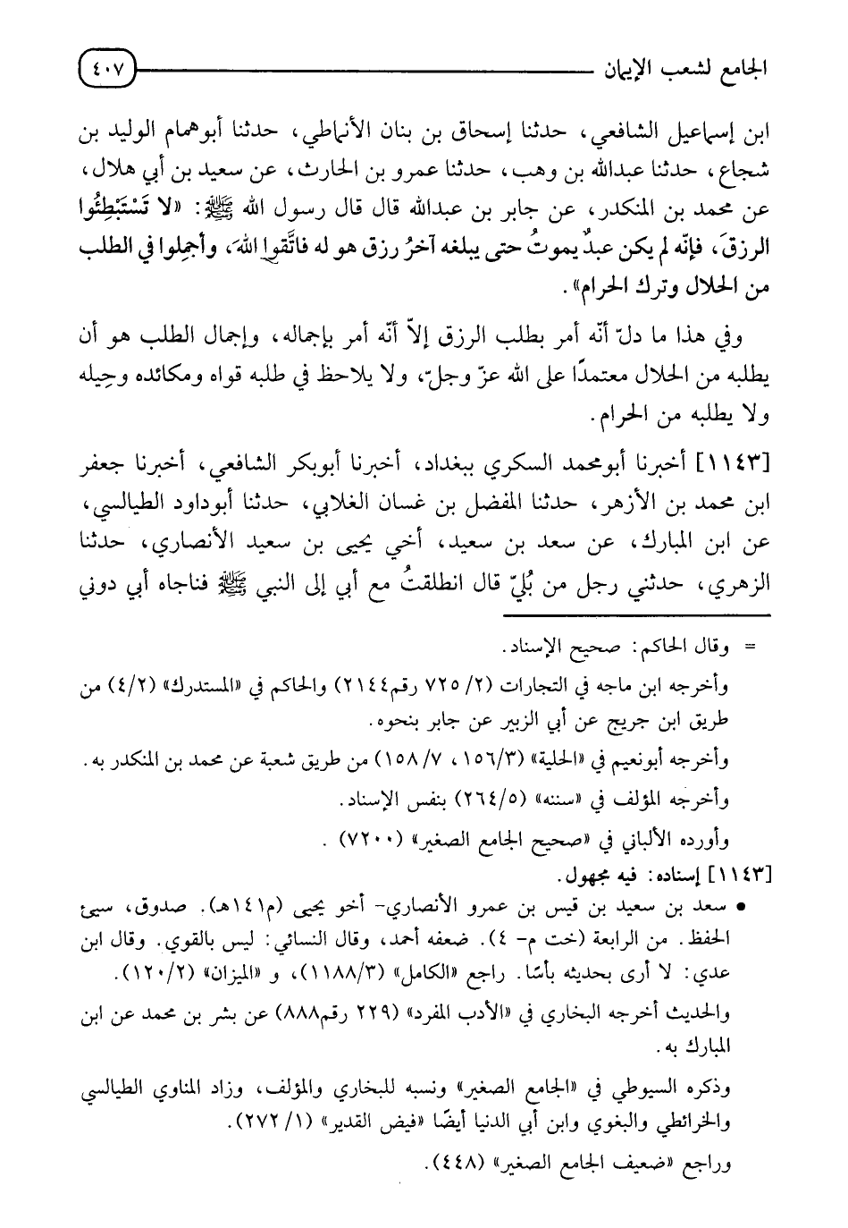 1143 - أَخْبَرَنَا أَبُو مُحَمَّدٍ السُّكَّرِيُّ، بِبَغْدَادَ، أَخْبَرَنَا أَبُو بَكْرٍ الشَّافِعِيُّ، أَخْبَرَنَا جَعْفَرُ بْنُ مُحَمَّدِ بْنِ الْأَزْهَرِ، حَدَّثَنَا الْمُفَضَّلُ بْنُ غَسَّانَ الْغَلَابِيُّ، حَدَّثَنَا أَبُو دَاوُدَ الطَّيَالِسِيُّ، عَنِ ابْنِ الْمُبَارَكِ، عَنْ سَعْدِ بْنِ سَعِيدٍ، أَخِي يَحْيَى بْنِ سَعِيدٍ الْأَنْصَارِيُّ، حَدَّثَنَا الزُّهْرِيُّ، حَدَّثَنِي رَجُلٌ، مِنْ بَلِيٍّ قَالَ: انْطَلَقْتُ مَعَ أَبِي إِلَى النَّبِيِّ صَلَّى اللَّهُ عَلَيْهِ وَسَلَّمَ، فَنَاجَاه أَبِي دُونِي -[408]- فَقُلْتُ لِأَبِي: مَا قَالَ لَكَ رَسُولُ اللهِ صَلَّى اللَّهُ عَلَيْهِ وَسَلَّمَ؟ قَالَ: قَالَ: §" إِذَا أَرَدْتَ أَمْرًا فَعَلَيْكَ بِالتُّؤَدَةِ حَتَّى يَجْعَلَ اللهُ لَكَ مَخْرَجًا " أَوْ قَالَ: " فَرَجًا "