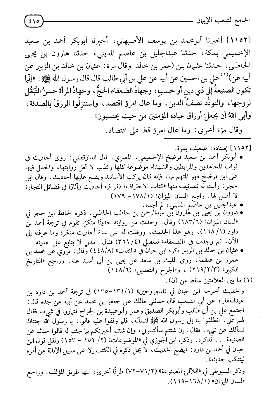 1152 - أَخْبَرَنَا أَبُو مُحَمَّدِ بْنُ يُوسُفَ الْأَصْبَهَانِيُّ، أَخْبَرَنَا أَبُو بَكْرٍ أَحْمَدُ بْنُ سَعِيدٍ الْإِخْمِيمِيُّ بِمَكَّةَ، حَدَّثَنَا عَبْدُ الْجَلِيلِ بْنُ عَاصِمٍ الْمَدِينِيُّ، حَدَّثَنَا هَارُونُ بْنُ يَحْيَى الْحَاطِبِيُّ، حَدَّثَنَا عُثْمَانُ بْنُ عُمَرَ بْنِ خَالِدٍ، - وَقَالَ مَرَّةً: عُثْمَانُ بْنُ خَالِدِ بْنِ الزُّبَيْرِ، عَنْ أَبِيهِ، عَنْ عَلِيِّ بْنِ الْحُسَيْنِ، عَنْ أَبِيهِ، عَنْ عَلِيِّ بْنِ أَبِي طَالِبٍ، قَالَ: قَالَ رَسُولُ اللهِ صَلَّى اللَّهُ عَلَيْهِ وَسَلَّمَ: " إِنَّمَا §تَكُونُ الصَّنِيعَةُ إِلَى ذِي دِينٍ أَوْ حَسَبٍ، وَجِهَادُ الضُّعَفَاءِ الْحَجُّ، وَجِهَادُ الْمَرْأَةِ حُسْنُ التَّبَعُّلِ لِزَوْجِهَا، وَالتَّوَدُّدُ نِصْفُ الدِّينِ، وَمَا عَالَ امْرُؤٌ اقْتَصَدَ، وَاسْتَنْزِلُوا الرِّزْقَ بِالصَّدَقَةِ، وَأَبَى اللهُ أَنْ يَجْعَلَ أَرْزَاقَ عِبَادِهِ الْمُؤْمِنِينَ مِنْ حَيْثُ يَحْتَسِبُونَ " وَقَالَ مَرَّةً أُخْرَى: " وَمَا عَالَ امْرُؤٌ قَطُّ عَلَى اقْتِصَادٍ " -[416]- قَالَ الْإِمَامُ أَحْمَدُ رَحِمَهُ اللهُ تَعَالَى: " وَهَذَا حَدِيثٌ لَا أَحْفَظُهُ عَلَى هَذَا الْوَجْهِ إِلَّا بِهَذَا الْإِسْنَادِ وَهُوَ ضَعِيفٌ مَرَّةً، فَإِنْ صَحَّ فَمَعْنَاهُ: أَبَى اللهُ أَنْ يَجْعَلَ جَمِيعَ أَرْزَاقِهِمْ مِنْ حَيْثُ يَحْتَسِبُونَ وَهُوَ كَذَلِكَ فَإِنَّ اللهَ يَرْزُقُ عِبَادَهُ مِنْ حَيْثُ يَحْتَسِبُونَ، كَمَا أَنَّ التَّاجِرَ يَرْزُقُهُ مِنْ تِجَارَتِهِ، وَالْحَارِثَ يَرْزُقُهُ مِنْ حِرَاثَتِهِ وَغَيْرَ ذَلِكَ، وَقَدْ يَرْزُقُهُمْ مِنَ حَيْثُ لَا يَحْتَسِبُونَ كَالرَّجُلِ يُصِيبُ مَعْدِنًا أَوْ كَنْزًا، أَوْ يَمُوتُ لَهُ قَرِيبٌ فَيَرِثُهُ، أَوْ يُعْطَى مِنْ غَيْرِ إِشْرَافِ نَفْسٍ وَلَا سُؤَالٍ وَنَحْنُ لَمْ نَقُلْ: إِنَّ اللهَ تَعَالَى لَمْ يُوَصِّلْ أَحَدًا إِلَى خَيْرٍ إِلَّا بِجَهْدٍ وَسَعْيٍ؛ وَإِنَّمَا قُلْنَا: إِنَّهُ قَدْ بَيَّنَ لِخَلْقِهِ وَعِبَادِهِ طَرِيقًا جَعَلَهَا أَسْبَابًا لَهُمْ إِلَى مَا يُرِيدُونَ فَالْأَولَى بِهِمْ أَنْ يَسْلُكُوهَا مُتَوَكِّلِينَ عَلَى اللهِ تَعَالَى من بُلُوغِ مَا يُؤَمِّلُونَهُ دُونَ أَنْ يُعْرِضُوا عَنْهَا، وَيُجَرِّدُوا التَّوَكُّلَ عَنْهَا وَلَيْسَ فِي شَيْءٍ مِنْ هَذِهِ الْأَحَادِيثِ مَا يُفْسِدُ قَوْلَنَا وَاللهُ تَعَالَى أَعْلَمُ "