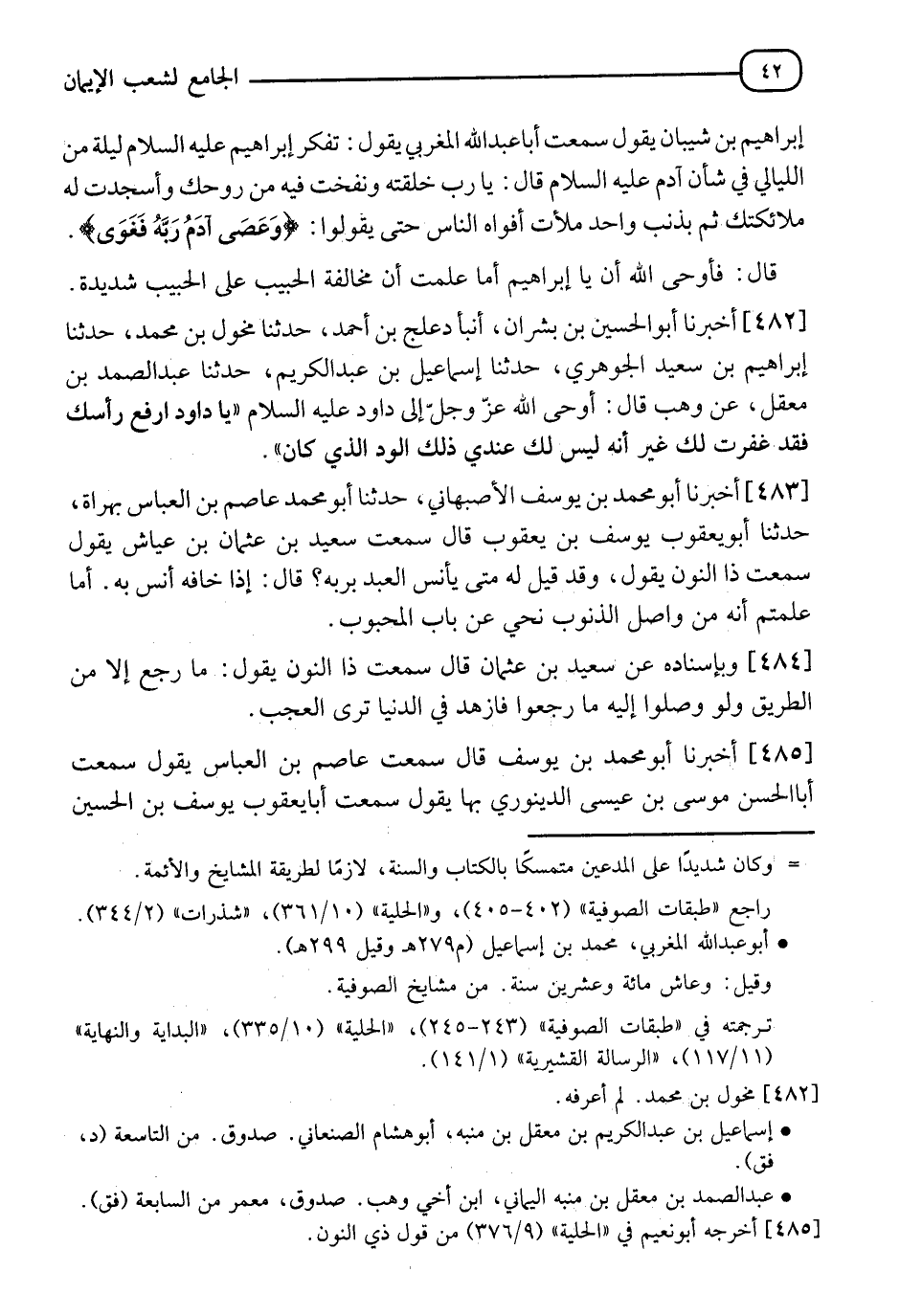 485 - أَخْبَرَنَا أَبُو مُحَمَّدِ بْنُ يُوسُفَ قَالَ: سَمِعْتُ عَاصِمَ بْنَ الْعَبَّاسِ يَقُولُ: سَمِعْتُ أَبَا الْحَسَنِ مُوسَى بْنَ عِيسَى الدِّينَوْرِيَّ بِهَا يَقُولُ: سَمِعْتُ أَبَا يَعْقُوبَ يُوسُفَ بْنَ الْحُسَيْنِ -[43]- الرَّازِيَّ يَقُولُ: سَمِعْتُ ذَا النُّونِ الْمِصْرِيَّ يَقُولُ: " §وَجَدْتُ صَخْرَةً بِبَيْتِ الْمَقْدِسِ عَلَيْهَا أَسْطُرٌ مَكْتُوبَةٌ، فَجِئْتُ مَنْ تَرْجَمَهَا، فَإِذَا عَلَيْهَا مَكْتُوبٌ: كُلُّ عَاصٍ مُسْتَوْحِشٌ، وَكُلُّ مُطِيعٍ مُسْتَأْنِسٌ، وَكُلُّ خَائِفٍ هَارِبٌ، وَكُلُّ رَاجٍ طَالِبٌ، وَكُلُّ قَانِعٍ غَنِيٌّ، وَكُلُّ مُحِبٍّ ذَلِيلٌ فَفَكَّرْتُ فِي هَذِهِ الْأَحْرُفِ فَإِذَا هِيَ أُصُولٌ كُلُّهَا اسْتَعْبَدَ اللهُ عَزَّ وَجَلَّ بِهِ الْخَلْقَ "