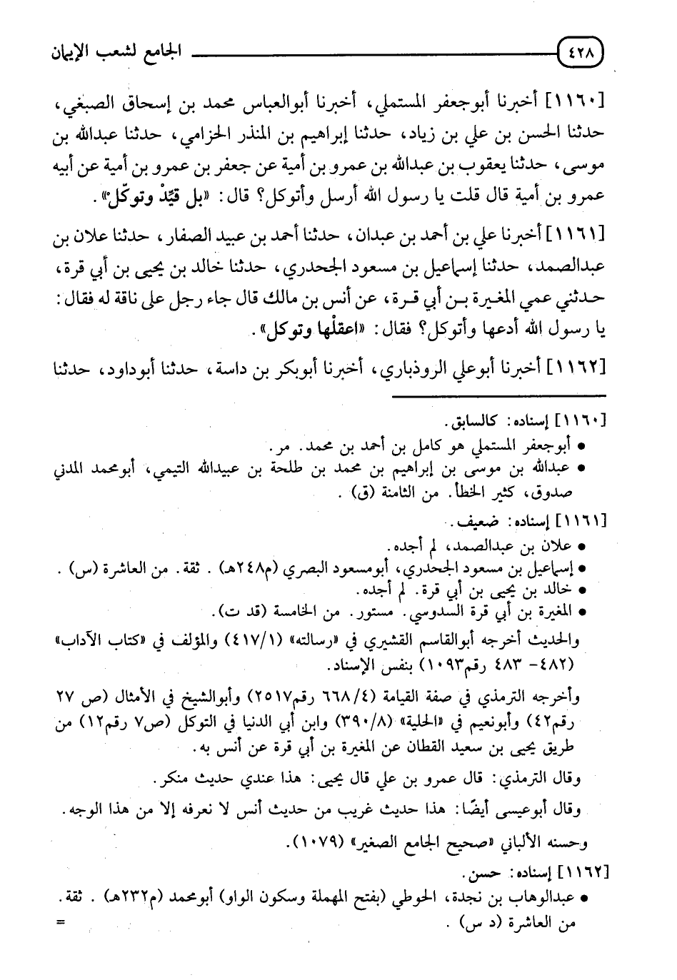 1160 - أَخْبَرَنَا أَبُو جَعْفَرٍ الْمُسْتَمْلِي، أَخْبَرَنَا أَبُو الْعَبَّاسِ مُحَمَّدُ بْنُ إِسْحَاقَ الضَّبُعِيُّ، حَدَّثَنَا الْحَسَنُ بْنُ عَلِيِّ بْنِ زِيَادٍ، حَدَّثَنَا إِبْرَاهِيمُ بْنُ الْمُنْذِرِ الْحِزَامِيُّ، حَدَّثَنَا عَبْدُ اللهِ بْنُ مُوسَى، حَدَّثَنَا يَعْقُوبُ بْنُ عَبْدِ اللهِ بْنِ عَمْرِو بْنِ أُمَيَّةَ، عَنْ جَعْفَرِ بْنِ عَمْرِو بْنِ أُمَيَّةَ، عَنْ أَبِيهِ عَمْرِو بْنِ أُمَيَّةَ، قَالَ: قُلْتُ: يَا رَسُولَ اللهِ، أُرْسِلُ وَأَتَوَكَّلُ؟ قَالَ: §" بَلْ قَيِّدْ وَتَوَكَّلْ "