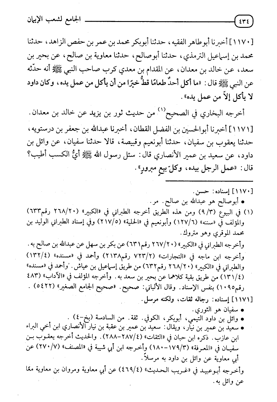 1170 - أَخْبَرَنَا أَبُو طَاهِرٍ الْفَقِيهُ، حَدَّثَنَا أَبُو بَكْرٍ مُحَمَّدُ بْنُ عُمَرَ بْنِ حَفْصٍ الزَّاهِدُ، حَدَّثَنَا مُحَمَّدُ بْنُ إِسْمَاعِيلَ التِّرْمِذِيُّ، حَدَّثَنَا أَبُو صَالِحٍ، حَدَّثَنَا مُعَاوِيَةُ بْنُ صَالِحٍ، عَنْ بُحَيْرِ بْنِ سَعْدٍ، عَنْ خَالِدِ بْنِ مَعْدَانَ، عَنِ الْمِقْدَامِ بْنِ مَعْدِي كَرِبَ صَاحِبِ النَّبِيِّ صَلَّى اللَّهُ عَلَيْهِ وَسَلَّمَ، أَنَّهُ حَدَّثَهُ عَنِ النَّبِيِّ صَلَّى اللَّهُ عَلَيْهِ وَسَلَّمَ، قَالَ: §" مَا أَكَلَ أَحَدٌ طَعَامًا قَطُّ خَيْرًا مِنْ أَنْ يَأْكُلَ مِنْ عَمَلِ يَدِهِ، وَكَانَ دَاوُدُ لَا يَأْكُلُ إِلَّا مِنْ عَمَلِ يَدِهِ " أَخْرَجَهُ الْبُخَارِيُّ فِي الصَّحِيحِ مِنْ حَدِيثِ ثَوْرِ بْنِ يَزِيدَ، عَنْ خَالِدِ بْنِ مَعْدَانَ