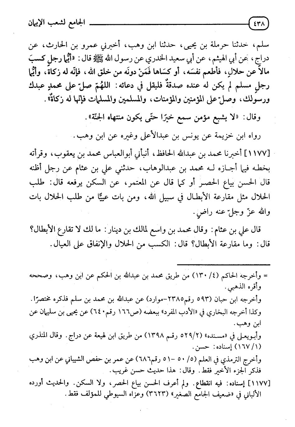 1177 - أَخْبَرَنَا مُحَمَّدُ بْنُ عَبْدِ اللهِ الْحَافِظُ، أَنْبَأَنِي أَبُو الْعَبَّاسِ مُحَمَّدُ بْنُ يَعْقُوبَ، وَقَرَأْتُهُ بِخَطِّهِ فِيمَا أَجَازَهُ لَهُ مُحَمَّدُ بْنُ عَبْدِ الْوَهَّابِ، حَدَّثَنِي عَلِيُّ بْنُ عَثَّامٍ، عَنْ رَجُلٍ أَظُنُّهُ قَالَ: الْحَسَنُ بَيَّاعُ الْحُصْرِ أَوْ كَمَا قَالَ عَنِ الْمُعْتَمِرِ، عَنِ السَّكَنِ يَرْفَعْهُ، قَالَ: " §طَلَبُ الْحَلَالِ مِثْلُ مُقَارَعَةِ الْأَبْطَالِ فِي سَبِيلِ اللهِ، وَمَنْ بَاتَ عَيِيًّا مِنْ طَلَبِ الْحَلَالِ بَاتَ وَاللهُ عَزَّ وَجَلَّ عَنْهُ رَاضٍ "