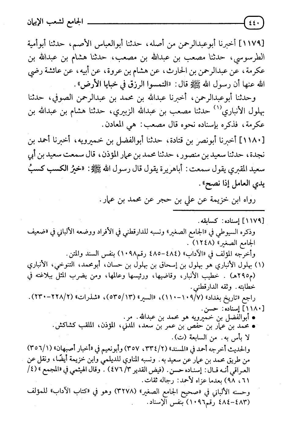 1180 - أخَبَرِنَا أَبُو نَصْرِ بْنُ قَتَادَةَ، حَدَّثَنَا أَبُو الْفَضْلِ بْنُ خُمَيْرَوَيْهِ، أَخْبَرَنَا أَحْمَدُ بْنُ نَجْدَةَ، حَدَّثَنَا سَعِيدُ بْنُ مَنْصُورٍ، حَدَّثَنَا مُحَمَّدُ بْنُ عَمَّارٍ الْمُؤَذِّنُ، قَالَ: سَمِعْتُ سَعِيدَ بْنَ أَبِي سَعِيدٍ الْمَقْبُرِيَّ، يَقُولُ: سَمِعْتُ أَبَا هُرَيْرَةَ، يَقُولُ: قَالَ رَسُولُ اللهِ صَلَّى اللَّهُ عَلَيْهِ وَسَلَّمَ: §" خَيْرُ الْكَسْبِ كَسْبُ يَدَيِ الْعَامِلِ إِذَا نَصَحَ " رَوَاهُ ابْنُ خُزَيْمَةَ، عَنْ عَلِيِّ بْنِ حَجَرٍ، عَنْ مُحَمَّدِ بْنِ عَمَّارٍ