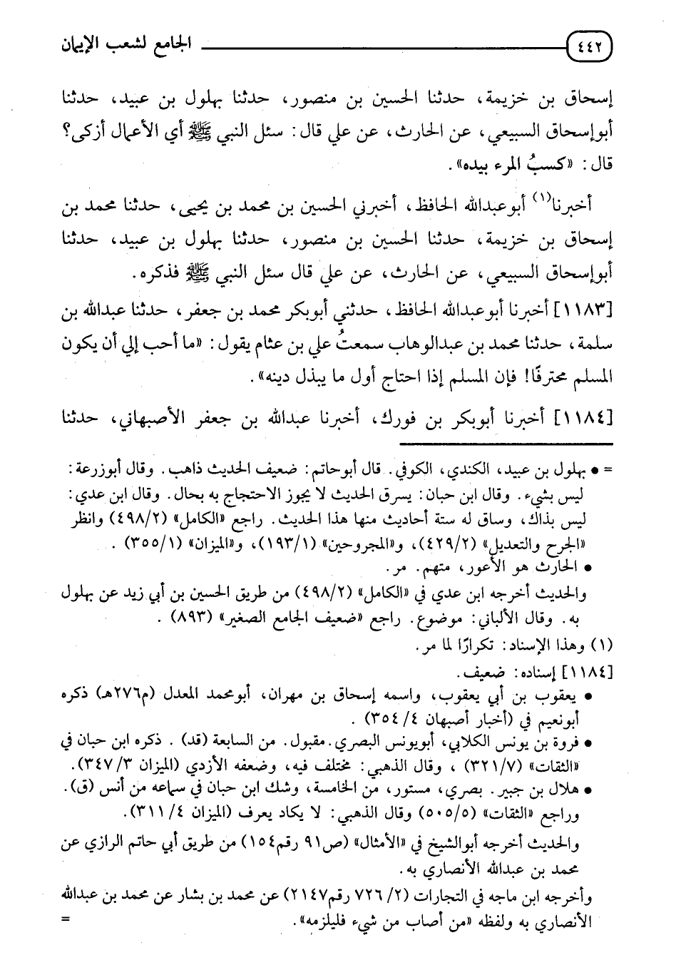 1183 - أَخْبَرَنَا أَبُو عَبْدِ اللهِ الْحَافِظُ، حَدَّثَنِي أَبُو بَكْرٍ مُحَمَّدُ بْنُ جَعْفَرٍ، حَدَّثَنَا عَبْدُ اللهِ بْنُ سَلَمَةَ، حَدَّثَنَا مُحَمَّدُ بْنُ عَبْدِ الْوَهَّابِ، سَمِعْتُ عَلِيَّ بْنَ عَثَّامٍ، يَقُولُ: " §مَا أَحَبُّ إِلَيَّ يَكُونَ الْمُسْلِمُ مُحْتَرِفًا، إِنَّ الْمُسْلِمَ إِذَا احْتَاجَ أَوَّلَ مَا يَبْذُلُ دِينَهُ "