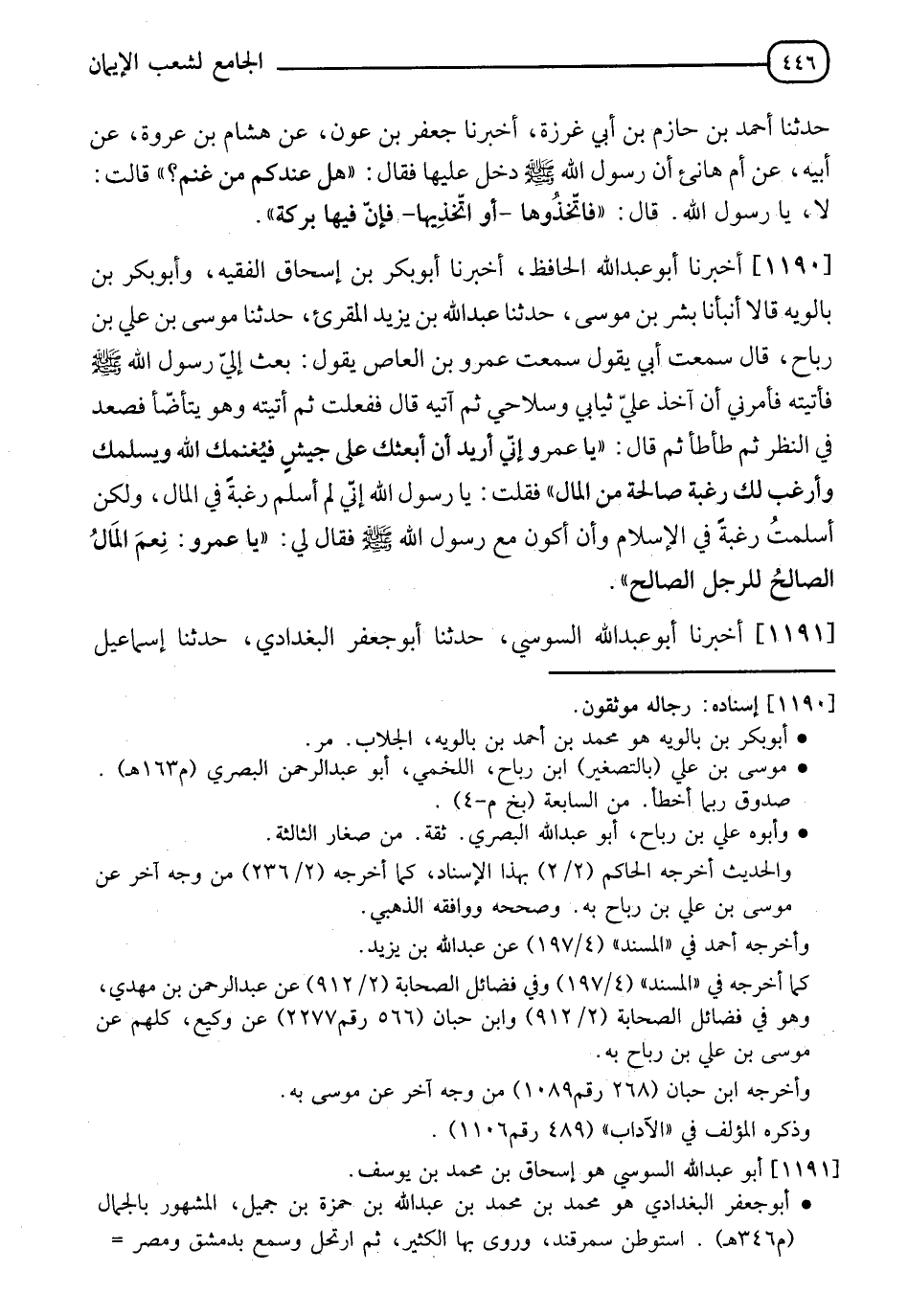 1190 - أَخْبَرَنَا أَبُو عَبْدِ اللهِ الْحَافِظُ، أَخْبَرَنَا أَبُو بَكْرِ بْنُ إِسْحَاقَ الْفَقِيهُ، وَأَبُو بَكْرِ بْنُ بَالَوَيْهِ قَالَا: أَنْبَأَنَا بِشْرُ بْنُ مُوسَى، حَدَّثَنَا عَبْدُ اللهِ بْنُ يَزِيدَ الْمُقْرِئُ، حَدَّثَنَا مُوسَى بْنُ عَلِيِّ بْنِ رَبَاحٍ، قَالَ: سَمِعْتُ أَبِي يَقُولُ: سَمِعْتُ عَمْرَو بْنَ الْعَاصِ، يَقُولُ: بَعَثَ إِلَيَّ رَسُولُ اللهِ صَلَّى اللَّهُ عَلَيْهِ وَسَلَّمَ، فَأَتَيْتُهُ فَأَمَرَنِي أَنْ آخُذَ عَلَيَّ ثِيَابِي وَسِلَاحِي، ثُمَّ آتِيَهُ قَالَ: فَفَعَلْتُ، ثُمَّ أَتَيْتُهُ وَهُوَ يَتَوَضَّأُ فَصَعَّدَ فِيَّ النَّظَرَ، ثُمَّ طَأْطَأَ، ثُمَّ قَالَ: " يَا عَمْرُو إِنِّي أُرِيدُ أَنْ أَبْعَثَكَ عَلَى جَيْشٍ فَيُغْنِمُكَ اللهُ وَيُسْلِمُكَ، وَأَرْغَبُ لَكَ رَغْبَةً صَالِحَةً مِنَ الْمَالِ "، فَقُلْتُ: يَا رَسُولَ اللهِ، إِنِّي لَمْ أُسْلِمْ رَغْبَةً فِي الْمَالِ، وَلَكِنْ أَسْلَمْتُ رَغْبَةً فِي الْإِسْلَامِ وَأَنْ أَكُونَ مَعَ رَسُولِ اللهِ صَلَّى اللَّهُ عَلَيْهِ وَسَلَّمَ فَقَالَ لِي: " يَا عَمْرُو: §نِعْمَ الْمَالُ الصَّالِحُ لِلرَّجُلِ الصَّالِحِ "