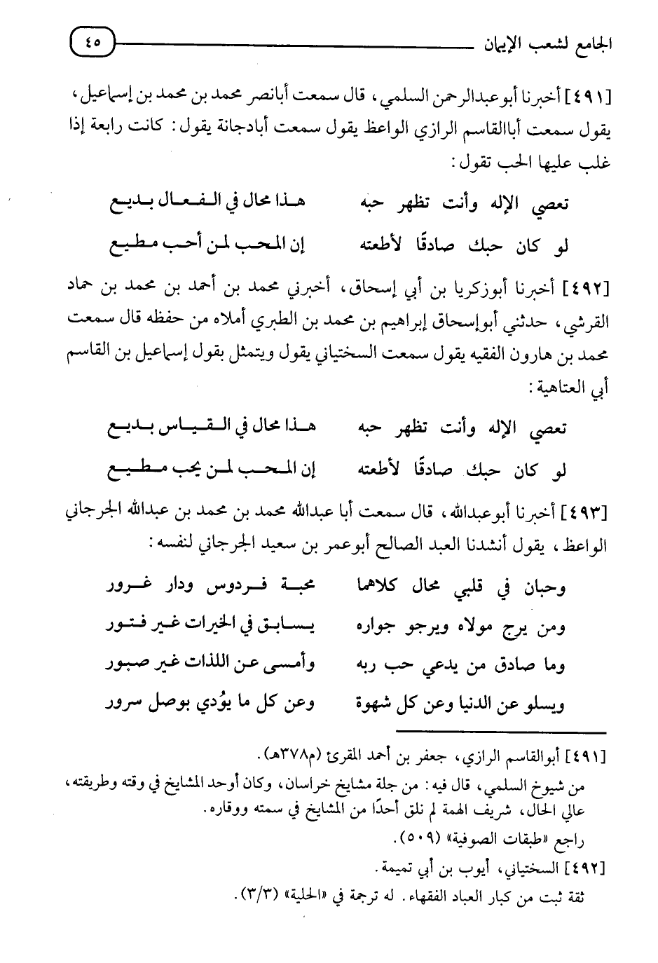 493 - أَخْبَرَنَا أَبُو عَبْدِ اللهِ قَالَ: سَمِعْتُ أَبَا عَبْدِ اللهِ مُحَمَّدَ بْنَ مُحَمَّدِ بْنِ عَبْدِ اللهِ الْجُرْجَانِيَّ الْوَاعِظَ يَقُولُ: أَنْشَدَنَا الْعَبْدُ الصَّالِحُ أَبُو عُمَرَ بْنُ سَعِيدٍ الْجُرْجَانِيُّ لِنَفْسِهِ"