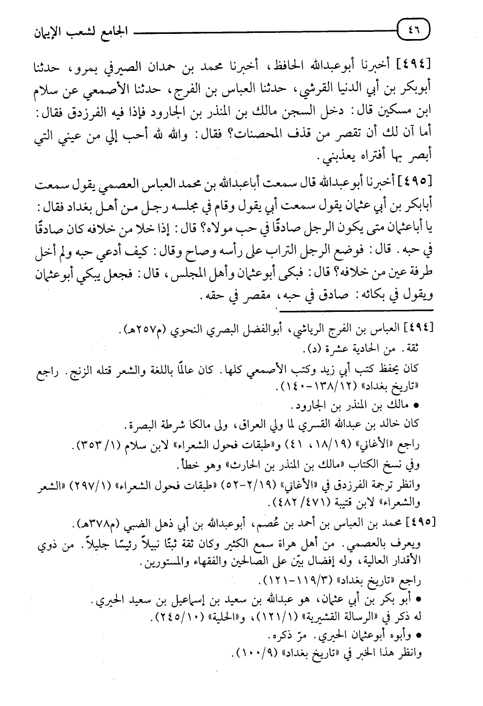 494 - أَخْبَرَنَا أَبُو عَبْدِ اللهِ الْحَافِظُ، أَخْبَرَنَا مُحَمَّدُ بْنُ حَمْدَانَ الصَّيْرَفِيُّ بِمَرْوَ، حدثنا أَبُو بَكْرِ بْنُ أَبِي الدُّنْيَا الْقُرَشِيُّ، حدثنا الْعَبَّاسُ بْنُ الْفَرَجِ، حدثنا الْأَصْمَعِيُّ، عَنْ سَلَّامِ بْنِ مِسْكِينٍ قَالَ: دَخَلَ السِّجْنَ مَالِكُ بْنُ الْمُنْذِرِ بْنِ الْجَارُودِ فَإِذَا فِيهِ الْفَرَزْدَقُ فَقَالَ: §أَمَا آنَ لَكَ أَنْ تُقْصِرَ مِنْ قَذْفِ الْمُحْصَنَاتِ؟ فَقَالَ: " وَاللهِ لَلَّهُ أَحَبُّ إِلَيَّ مِنْ عَيْنِي الَّتِي أُبْصِرُ بِهَا أَفَتُرَاهُ يُعَذِّبُنِي؟ "