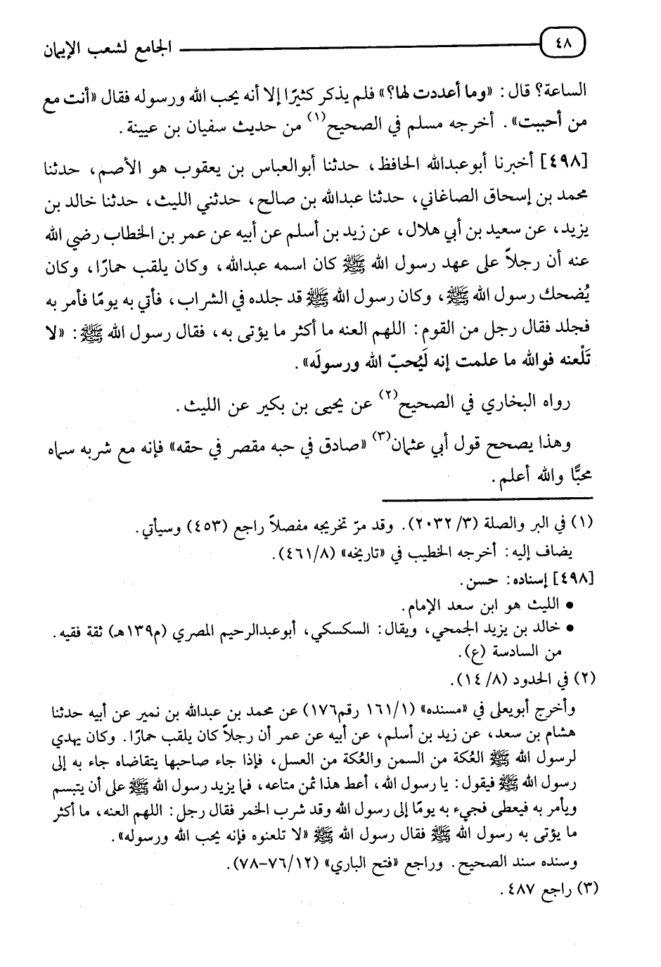498 - أَخْبَرَنَا أَبُو عَبْدِ اللهِ الْحَافِظُ، حدثنا أَبُو الْعَبَّاسِ بْنُ يَعْقُوبَ هُوَ الْأَصَمُّ، حدثنا مُحَمَّدُ بْنُ إِسْحَاقَ الصَّاغَانِيُّ، حدثنا عَبْدُ اللهِ بْنُ صَالِحٍ، حَدَّثَنِي اللَّيْثُ، حدثنا خَالِدُ بْنُ يَزِيدَ، عَنْ سَعِيدِ بْنِ أَبِي هِلَالٍ، عَنْ زَيْدِ بْنِ أَسْلَمَ، عَنْ أَبِيهِ، عَنْ عُمَرَ بْنِ الْخَطَّابِ رَضِيَ اللهُ عَنْهُ، أَنَّ رَجُلًا عَلَى عَهْدِ رَسُولِ اللهِ صَلَّى اللَّهُ عَلَيْهِ وَسَلَّمَ كَانَ اسْمُهُ عَبْدَ اللهِ وَكَانَ يُلَقَّبُ حِمَارًا، وَكَانَ يُضْحِكُ رَسُولَ اللهِ صَلَّى اللَّهُ عَلَيْهِ وَسَلَّمَ، وَكَانَ رَسُولُ اللهِ صَلَّى اللَّهُ عَلَيْهِ وَسَلَّمَ قَدْ جَلَدَهُ فِي الشَّرَابِ، فَأُتِيَ بِهِ يَوْمًا، فَأَمَرَ بِهِ فَجُلِدَ، فَقَالَ رَجُلٌ مِنَ الْقَوْمِ: اللهُمَّ الْعَنْهُ مَا أَكْثَرَ مَا يُؤْتَى بِهِ، فَقَالَ رَسُولُ اللهِ صَلَّى اللَّهُ عَلَيْهِ وَسَلَّمَ: " §لَا تَلْعَنْهُ، فَوَاللهِ مَا عَلِمْتُ أَنَّهُ لَيُحِبُّ اللهَ وَرَسُولَهُ " رَوَاهُ الْبُخَارِيُّ فِي الصَّحِيحِ، عَنْ يَحْيَى بْنِ بُكَيْرٍ، عَنِ اللَّيْثِ " وَهَذَا يُصَحِّحُ قَوْلَ: أَبِي عُثْمَانَ: صَادِقٌ فِي حُبِّهِ مُقَصِّرٌ فِي حَقِّهِ، فَإِنَّهُ مَعَ شُرْبِهِ سَمَّاهُ مُحِبًّا وَاللهُ أَعْلَمُ "